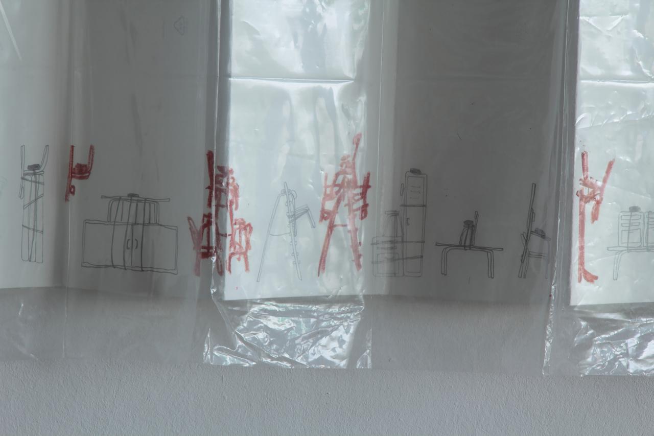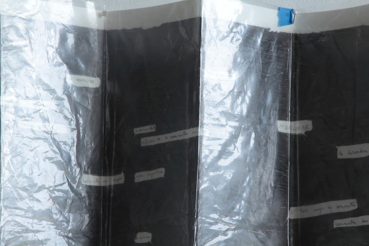 Pour le collectif Kurt Forever, au 6B, je propose de commettre l’irréversible. Littéralement. En entrant, je renverse accidentellement une peinture située dans le couloir. Puis, porté par les paroles d’Ophélie Winter, je décide de marcher à l’envers. La gravité s’inverse, le plafond se transforme en sol (grâce à des dossiers de chaises en formica scotchés à mes chaussures). Ladite promenade, le long d’une ligne jaune dessinée sur le plafond s’annonce difficile, lourde.