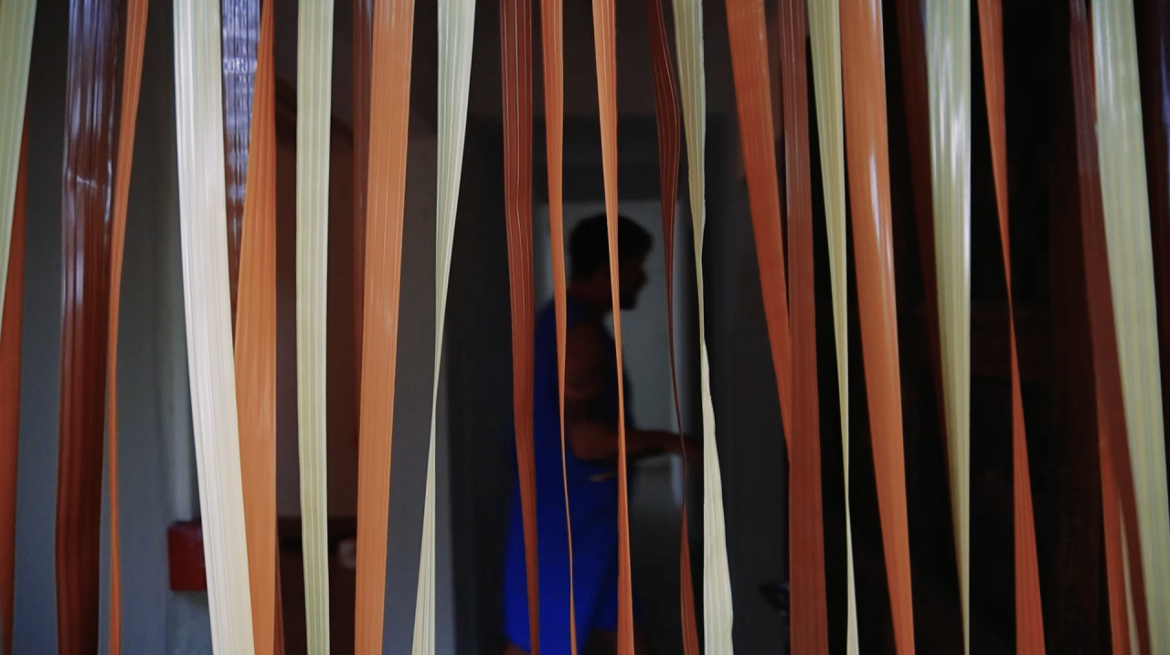 Chien de porte de 10 mètres, rideau anti-mouche, série de dessins A4 au pastel à la cire aquarellable, graphite et BIC, ensemble de 6 vidéos L’été de la tante de 15 secondes chacune et d’un néon de cuisine
