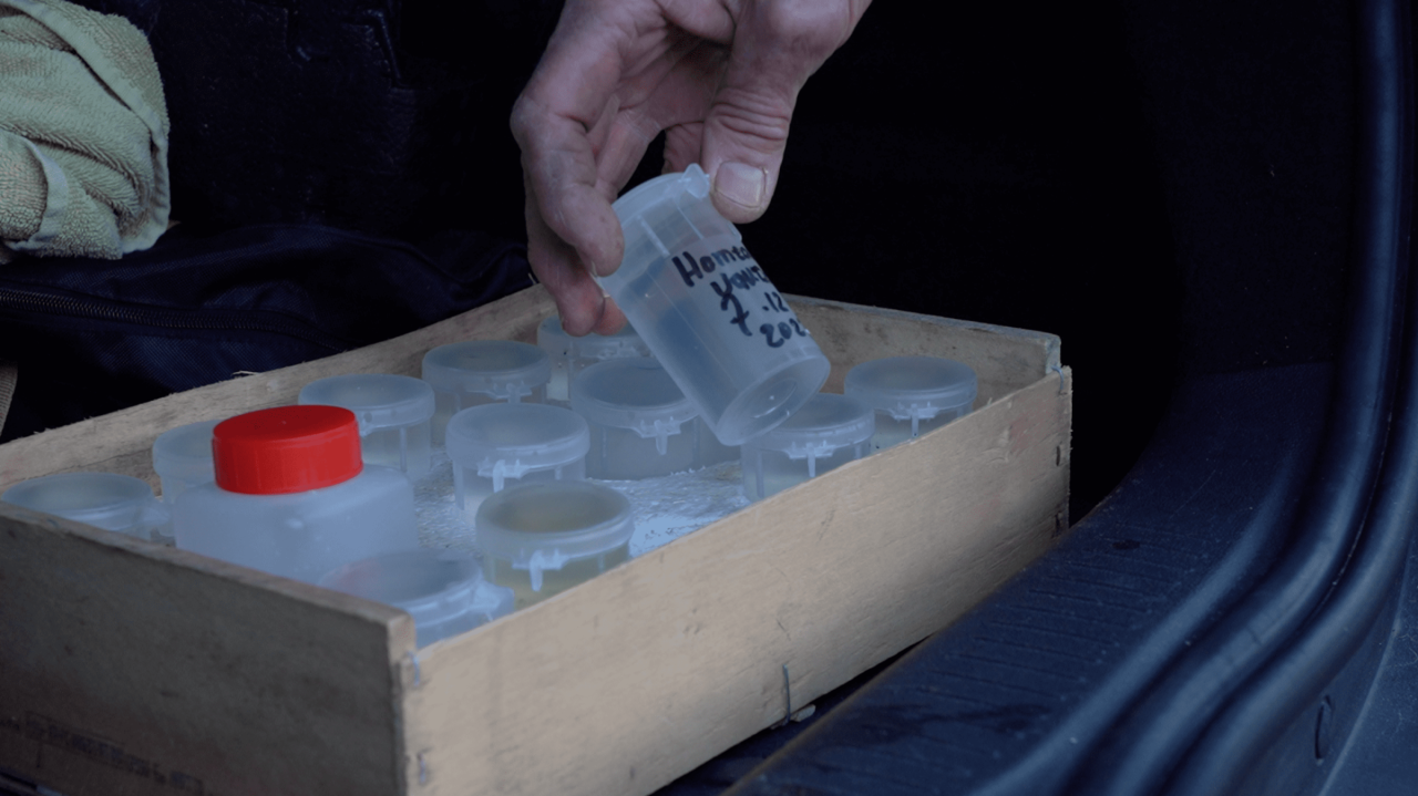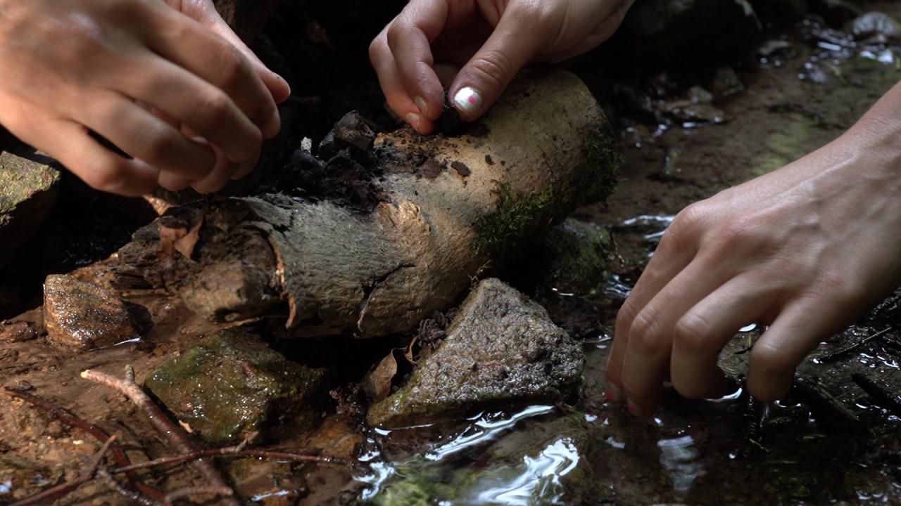 La première séquence, ouvrant l’exposition, dépeint des mains qui osent franchir une frontière. Elles ouvrent un couvercle et surgit alors le flux de l’eau, le flux d’informations et le flux du film de l’artiste lui-même : il « s’ébranle » ; il entame sa fabrication tout autant que sa diffusion en direction des visiteurs et des visiteuses. Ces mains s’avèrent d’ailleurs surprises par le potentiel qui surgit de la source atteinte ; une voix en sort, un peu balbutiante mais soulignant l’idée qu’une enquête est possible et qu’elle va précisément commencer.
