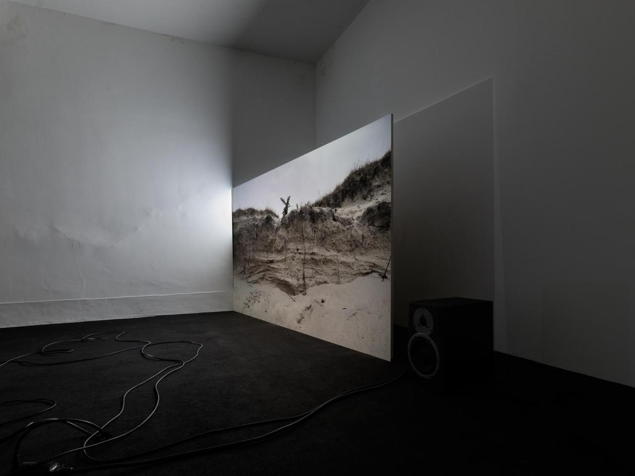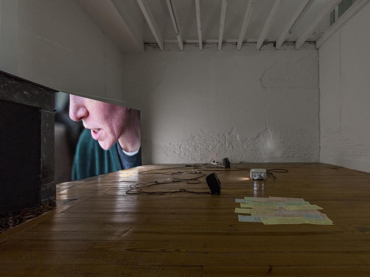 projections boucles vidéo, 5 vidéoprojecteurs, 5 panneaux de bois, 1 écran, 6 enceintes, textes imprimés du poème Haro du poète haguais Côtis-Capel (1915-1986)
