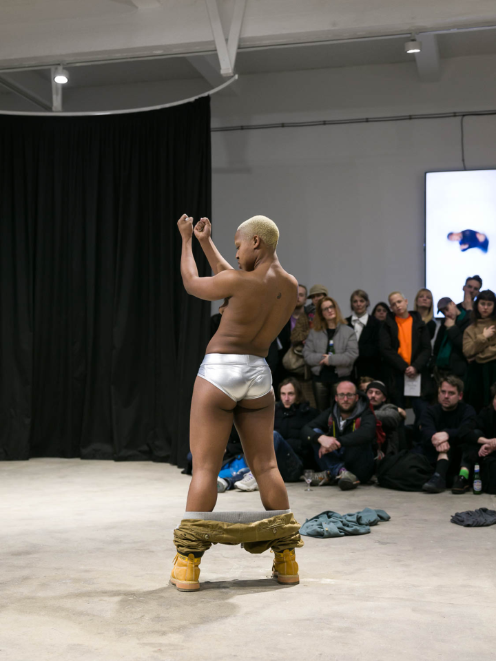 I took everything and made it my own (the ghost is an appropriationist), 2018, performance, sound piece Sophie Mallett, performers Charlie Laban Trier, Loveday Smith and Sophia van der Putten, as part of the three-part performance A fire circle for a public hearing, 45 min, Chisenhale Gallery, London, United Kingdom, photo Mark Blower