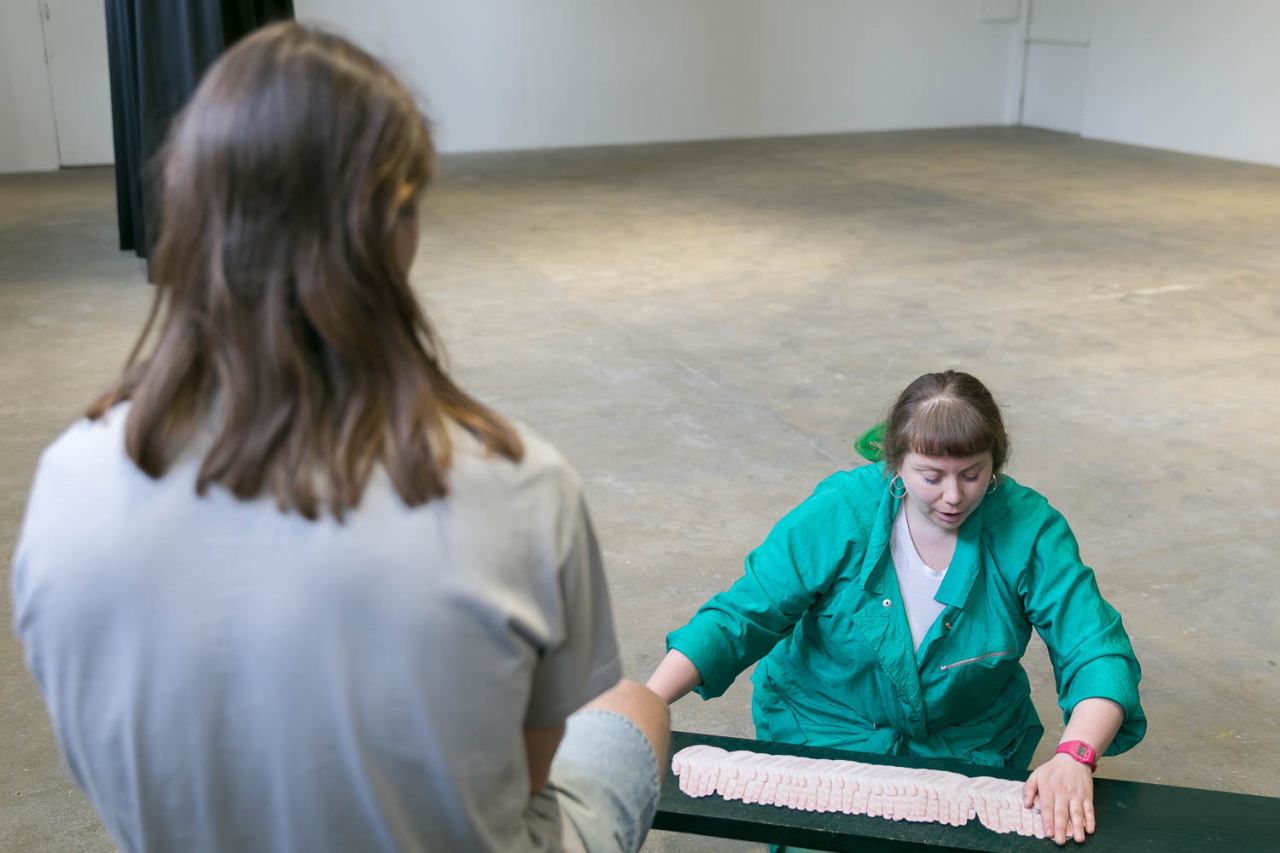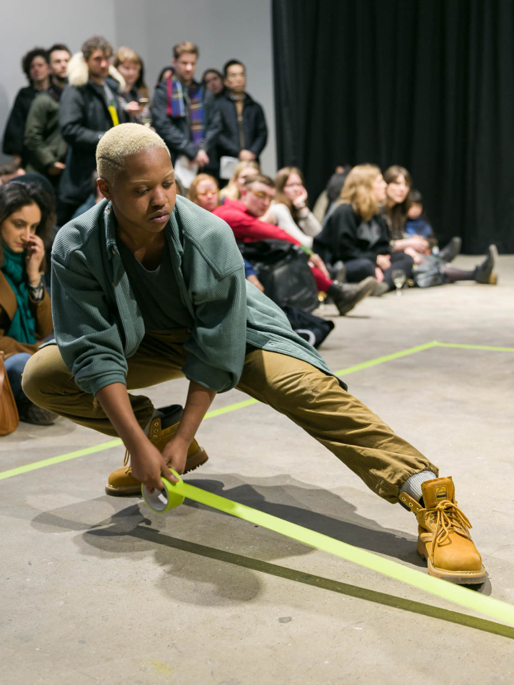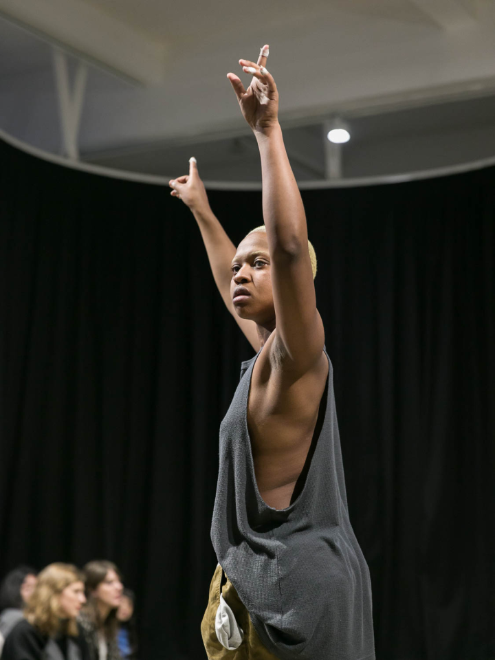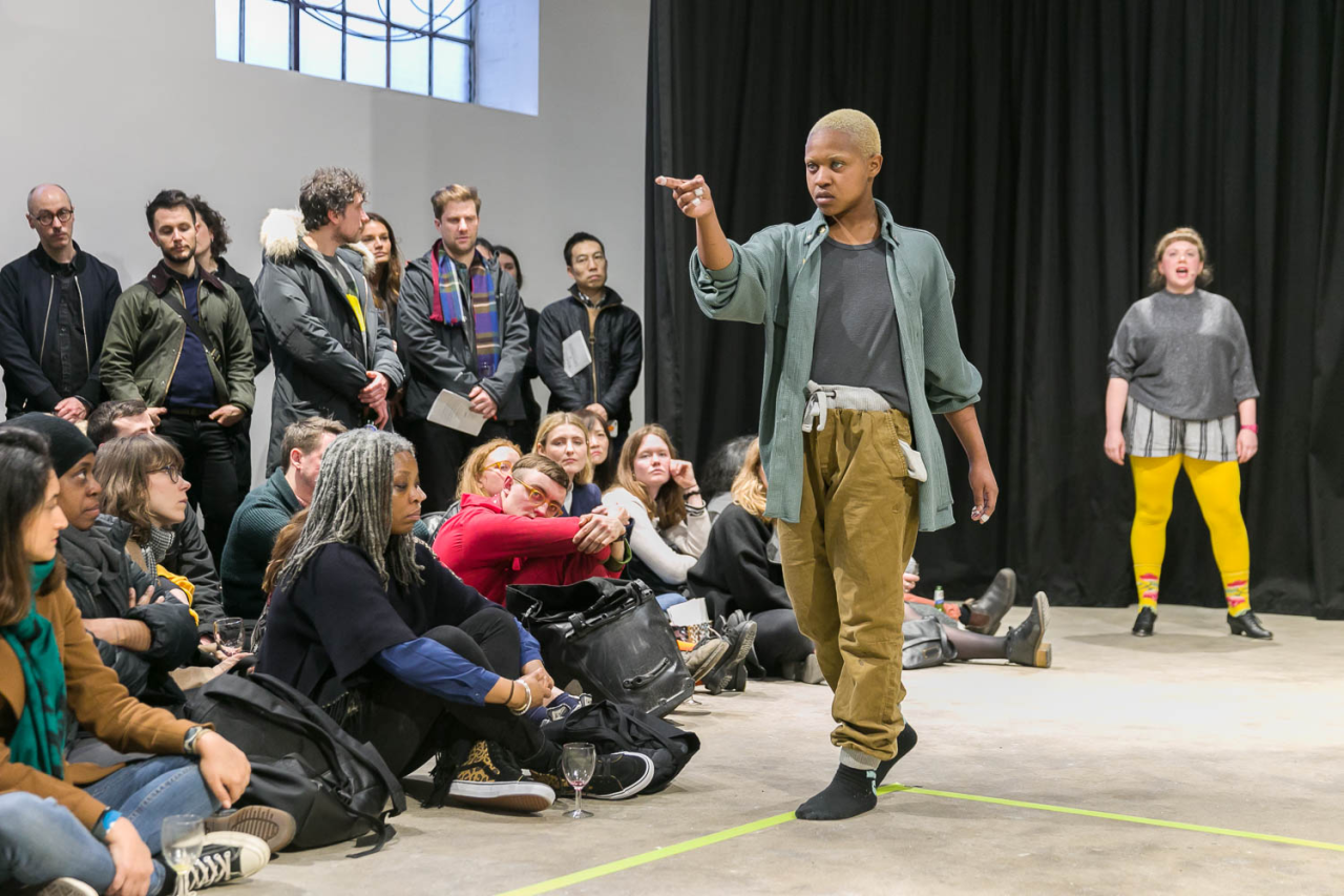 A place you only go through, 2018, performance,sound piece Sophie Mallett, performers Charlie Laban Trier, Loveday Smith and Sophia van der Putten, as part of the three-part performance A fire circle for a public hearing, 45 min, Chisenhale Gallery, London, United Kingdom, photo Mark Blower