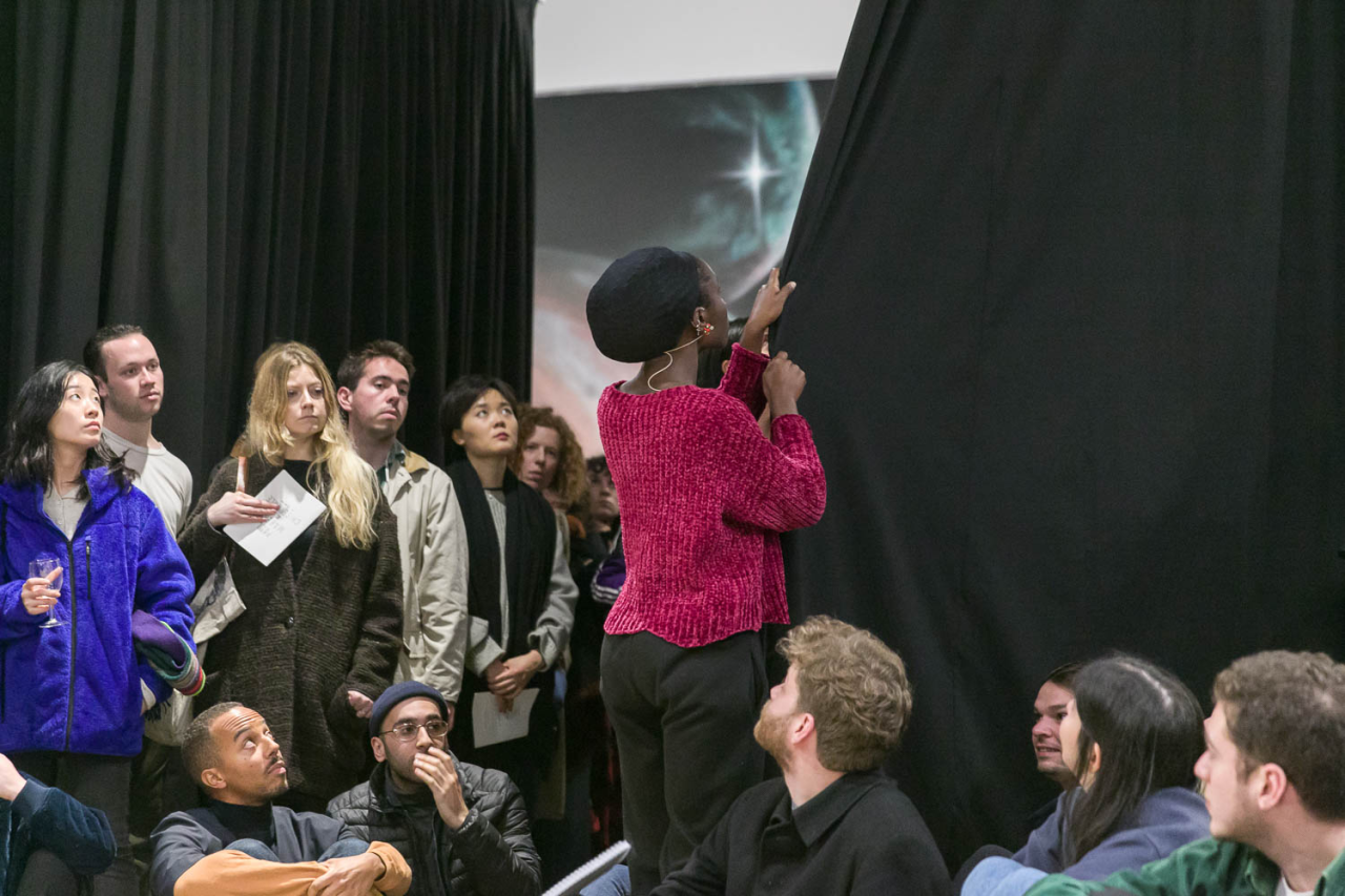 A fire circle for a public hearing seeks to consider how acts of visibility and invisibility serve to question the presence and absence of marginalised narratives in dominant histories, inviting visitors to assert their own understanding of possible pasts or futures. By speculating on worlds and life elsewhere, Maheke’s new exhibition at Chisenhale Gallery becomes a public site to re-articulate and reinvent forms of relationality and representation, as much as a device for developing a new lexicon for thinking about identities outside of identity politics.
