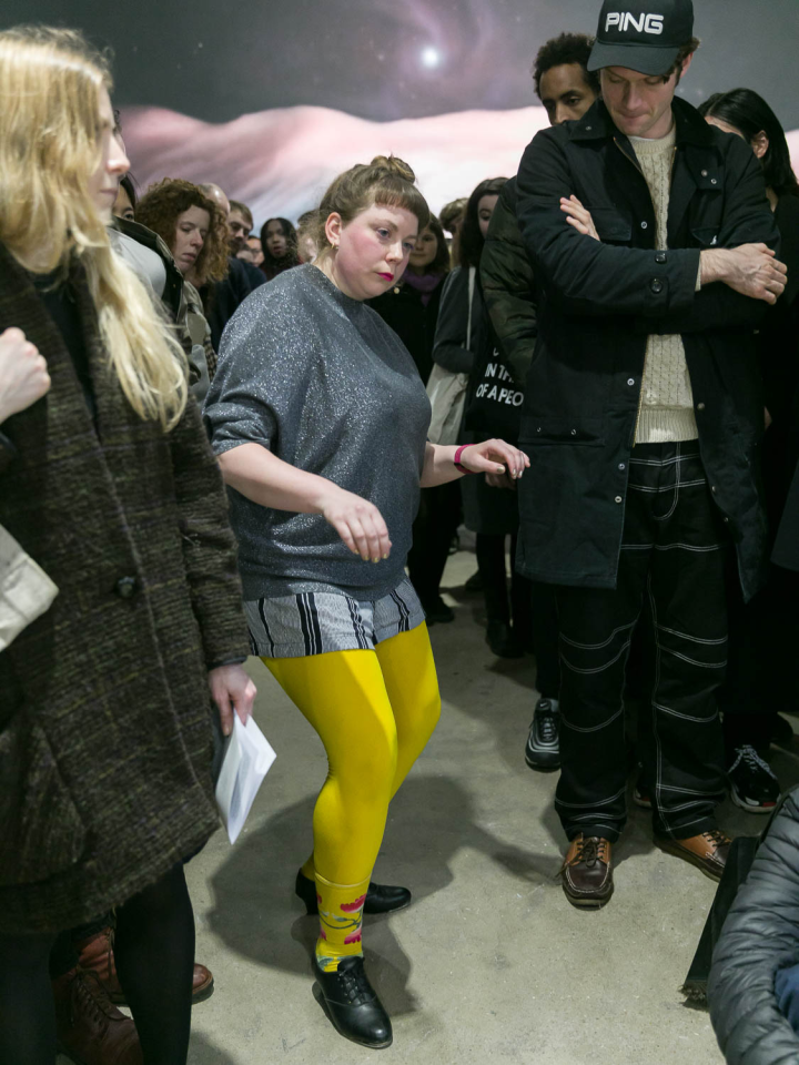 Entanglements (the assembly), 2018, performance, sound piece Sophie Mallett, performers Charlie Laban Trier, Loveday Smith and Sophia van der Putten, as part of the three-part performance A fire circle for a public hearing, 45 min, Chisenhale Gallery, London, United Kingdom, photo Mark Blower