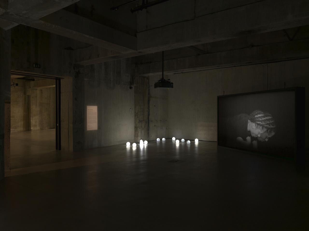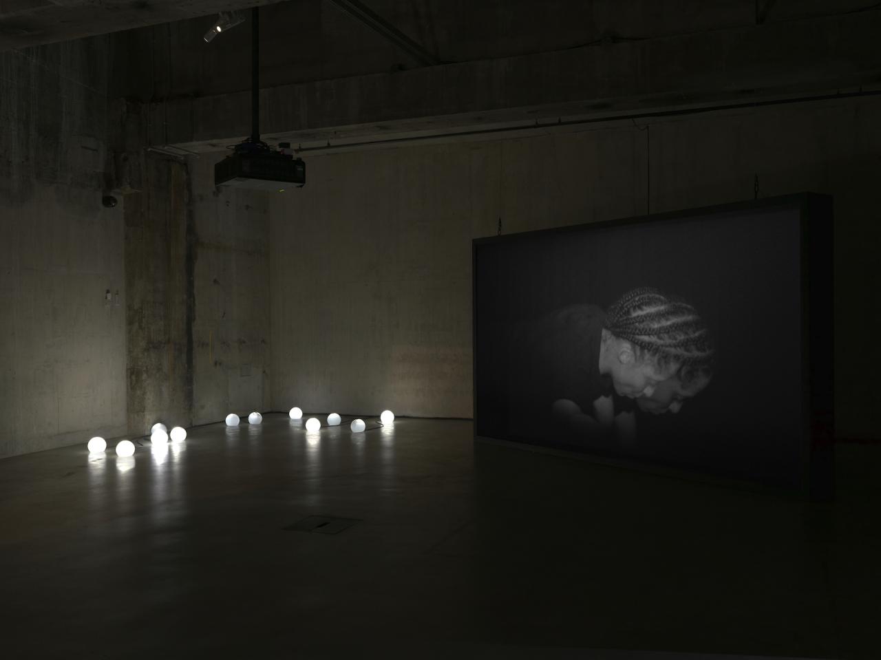 A video performance made in collaboration with the dancer and choreographer Ligia Lewis (born 1983) and the musician Nkisi (Melika Ngombe Kolongo) (born 1985) is projected onto a gauze fabric screen. Lewis repeats a sequence of movements to a pulsating electronic soundtrack, her form blurred. As the field of view shifts and phases, the figures of Maheke and Nkisi also briefly join Lewis in movement. Dressed in black, the three performers appear and disappear, hazy and ghostlike, against the background of a dark and indistinct space.