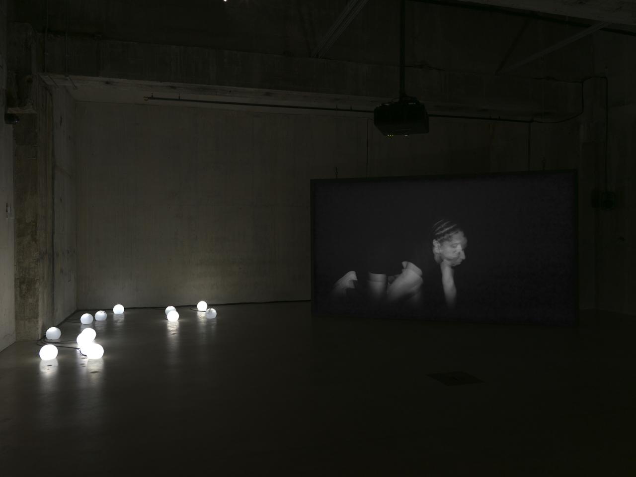 vidéo loop, black and white and sound, vinyl, resin, led light bulbs, gauze, synthetic hair and other materials