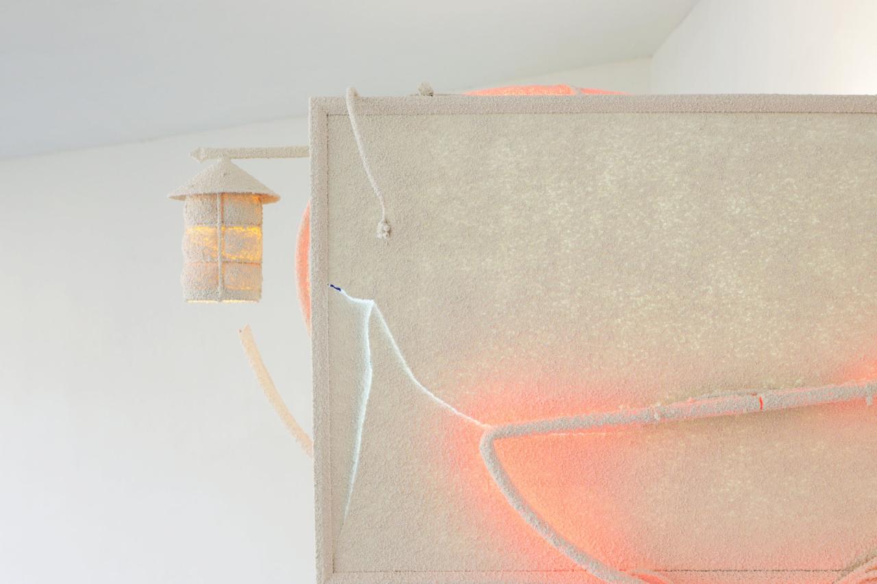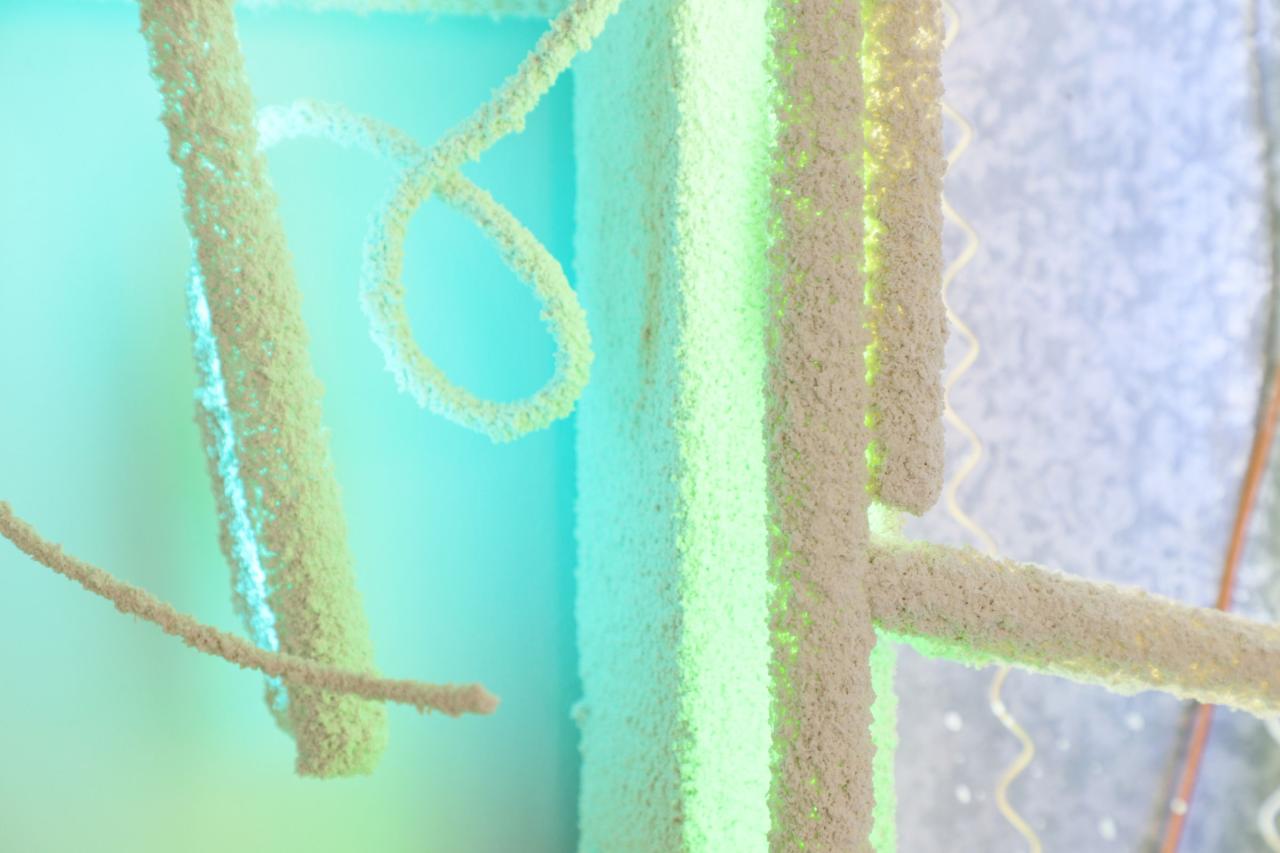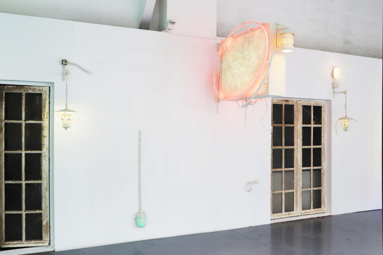Bar parallèle, 2022, site specific installation, old signs assembly, architecture elements, electrics cables, sheats, transformers, wall render, exhibition view at 2Angles, visual arts and contemporay dance residency in Flers, France, 2022, detail