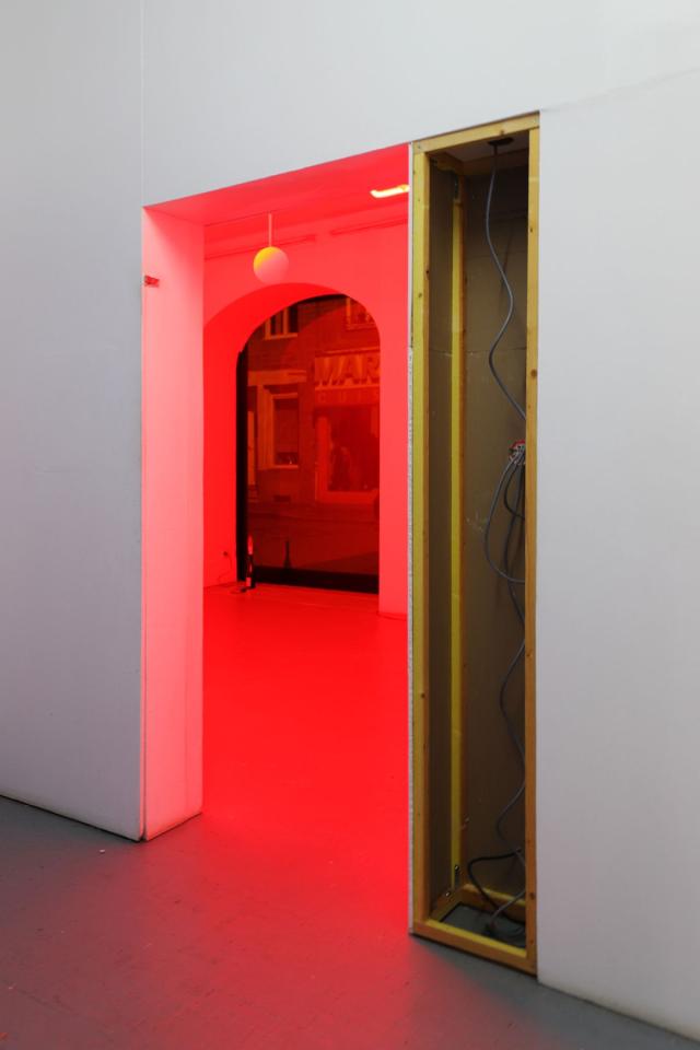 Depuis l’extérieur, il semblerait que rien ne se passe dans cet espace. Le commerce s’est évaporé ne laissant aucune trace de son activité. Son absence rend maintenant visible ce qui était alors invisible. Rampes lumineuses, plafonniers, câbles dénudés et services à liqueur, il ne reste plus que le vide en guise d’architecture intérieure.