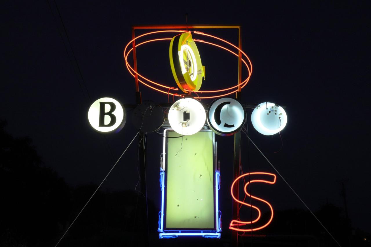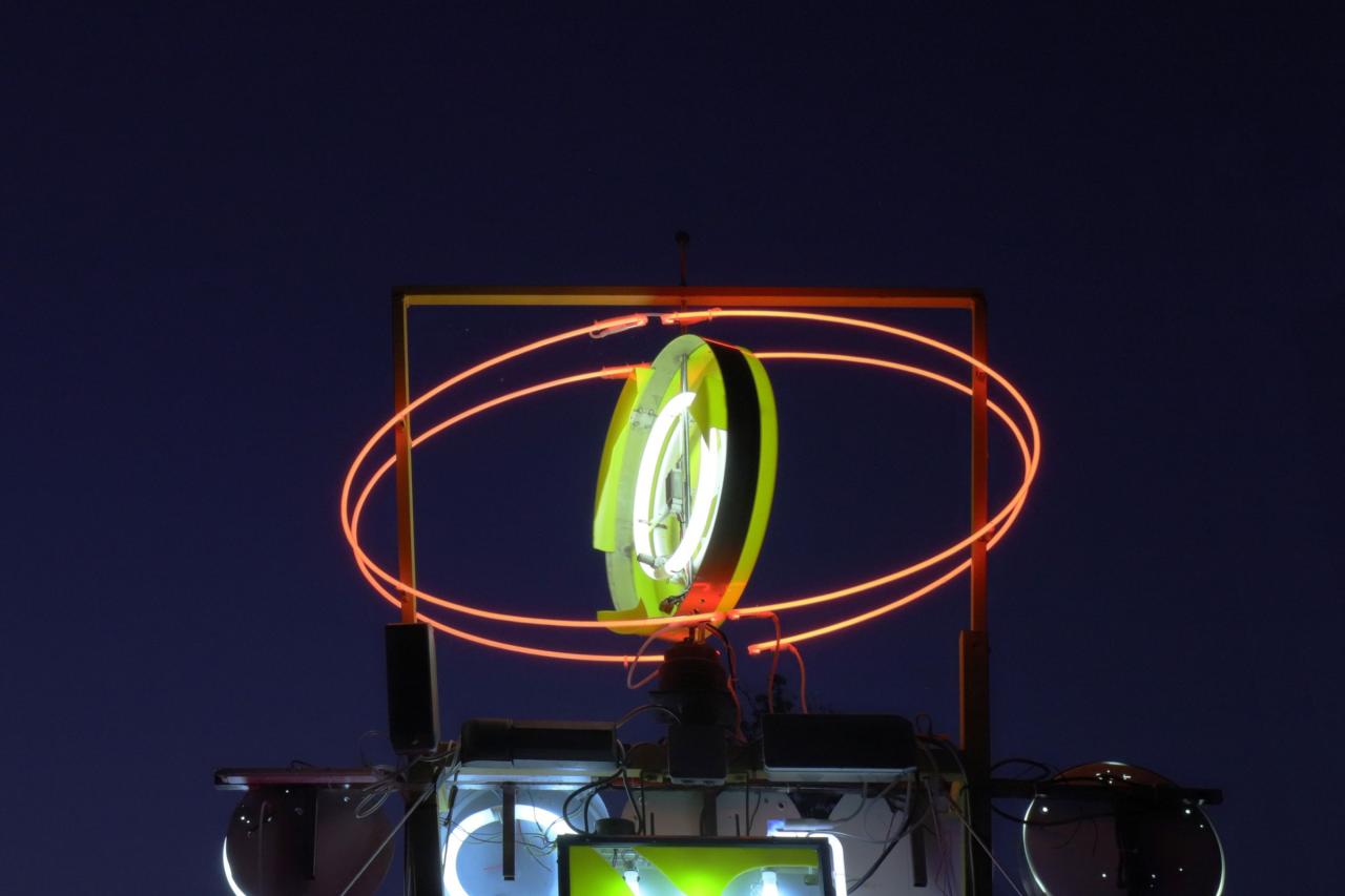 Black Sun (Motel), 2020, installation, old signs assembly, neon lights, steel, cables and transformers. Horizons d’eaux #4 exhibition view, contemporary art and live art route along the canal du Midi by les Abattoirs, Musée – Frac Occitanie Toulouse, in partnership with Festival Convivencia and the Frac Occitanie Montpellier, details