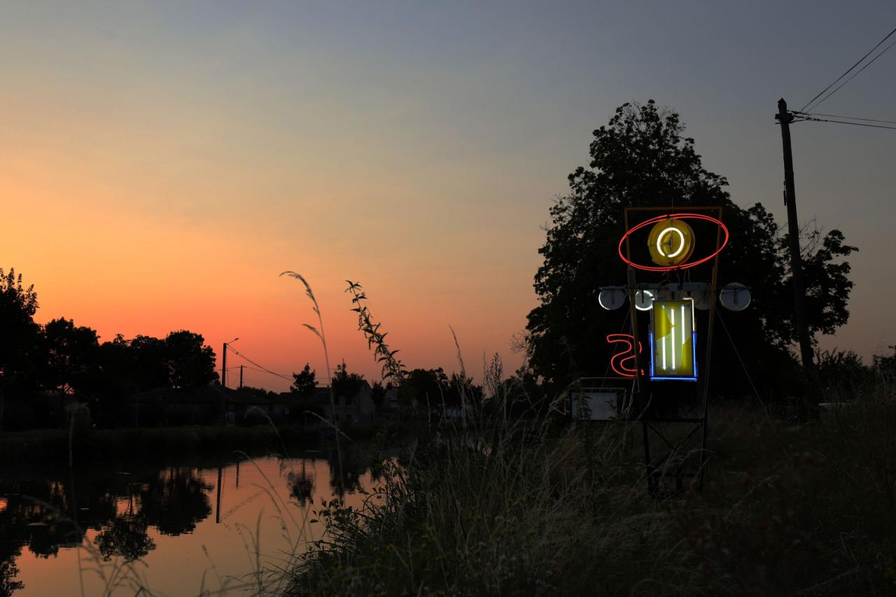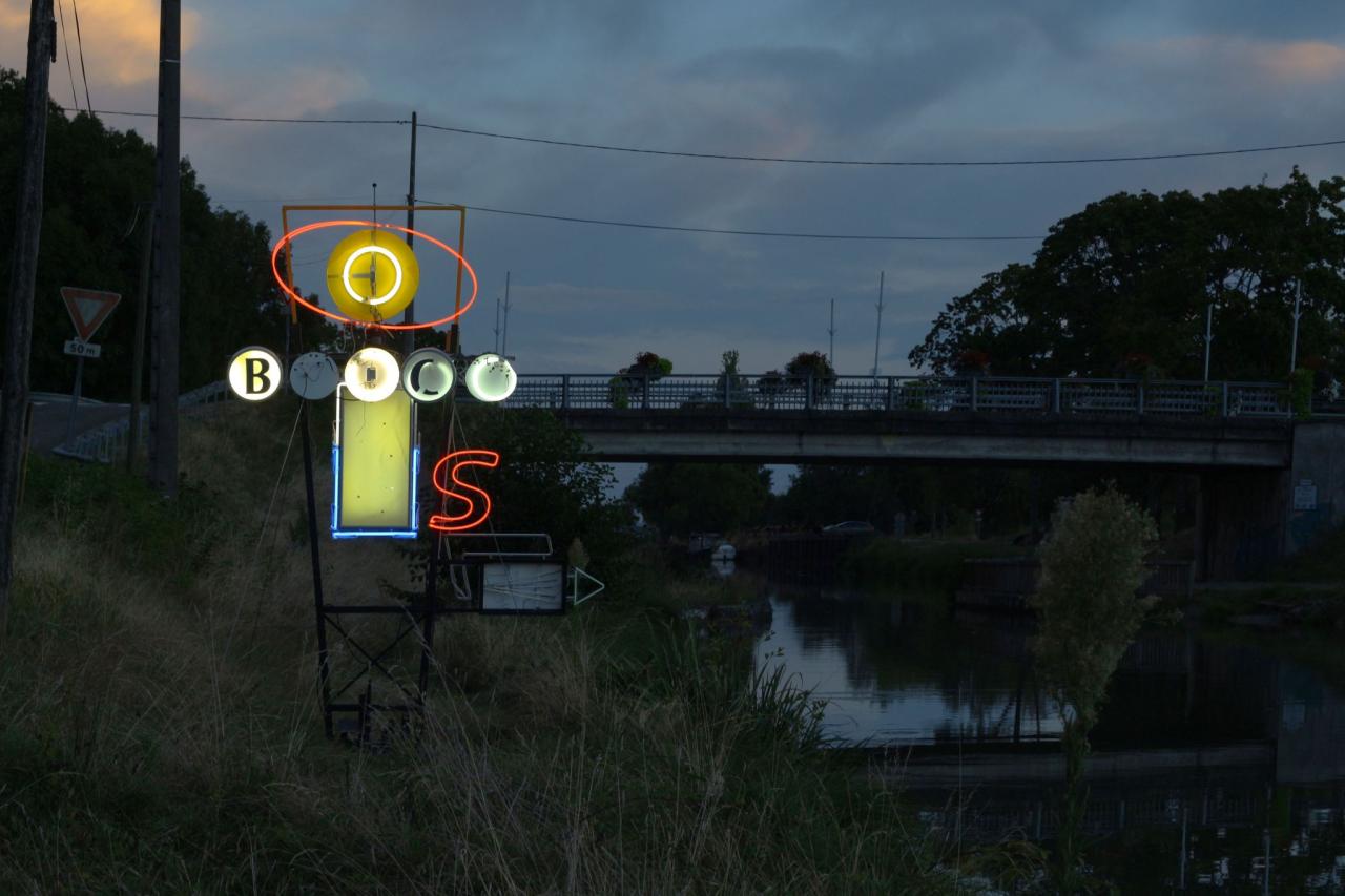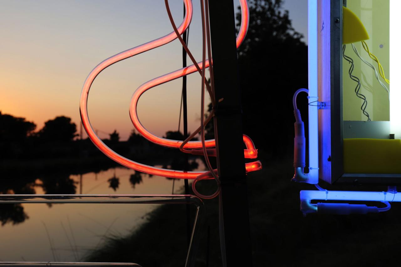 Le déploiement du signal lumineux dans l’espace, les reflets chamarrés des tubes de néon à la surface de l’eau et les défaillances électriques intrinsèquement liées à la vétusté des matériaux traduisent des questionnements artistiques autour de l’obsolescence et des formes de résistance. Les effacements, les manques, les oublis de certaines parties de l’enseigne rendent illisible son propre message lumineux et annihilent sa fonction première, opérant ainsi une réécriture et une relecture de l’œuvre dans ce qu’elle a de plus contextuel. L’implantation-même de la sculpture au sein de ce patrimoine paysager, au début d’un parcours visible tout l’été, donne alors à lire les premiers caractères difficilement déchiffrables de l’incipit tronqué d’une préface hasardeuse.