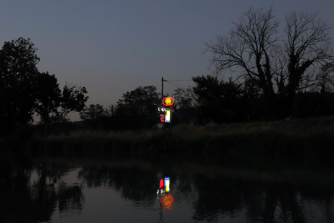 Black Sun (Motel), 2020, installation, old signs assembly, neon lights, steel, cables and transformers. Horizons d’eaux #4 exhibition view, contemporary art and live art route along the canal du Midi by les Abattoirs, Musée – Frac Occitanie Toulouse, in partnership with Festival Convivencia and the Frac Occitanie Montpellier.