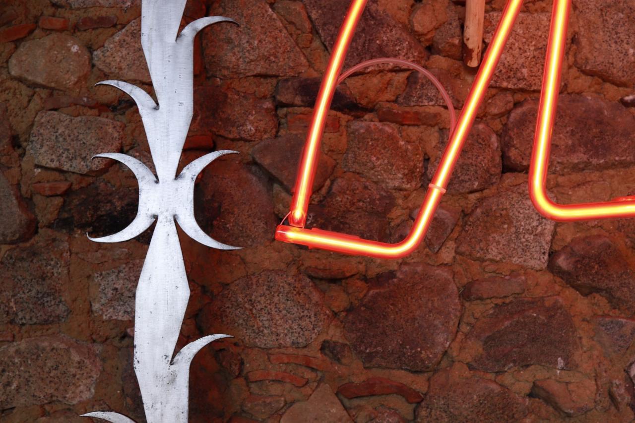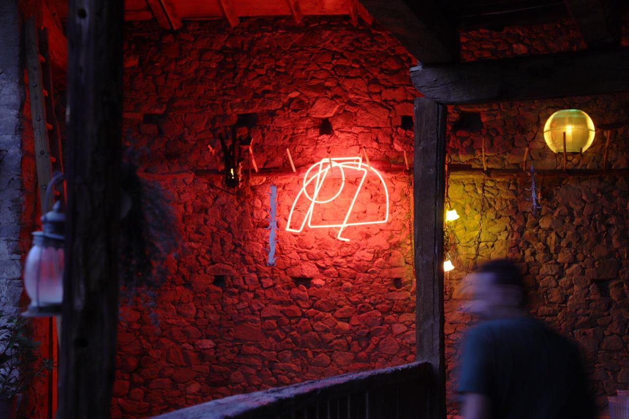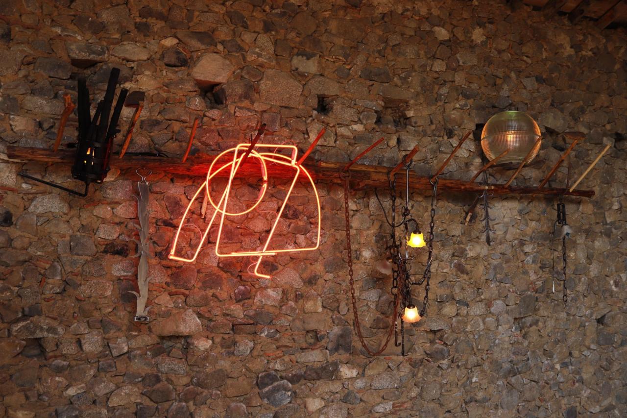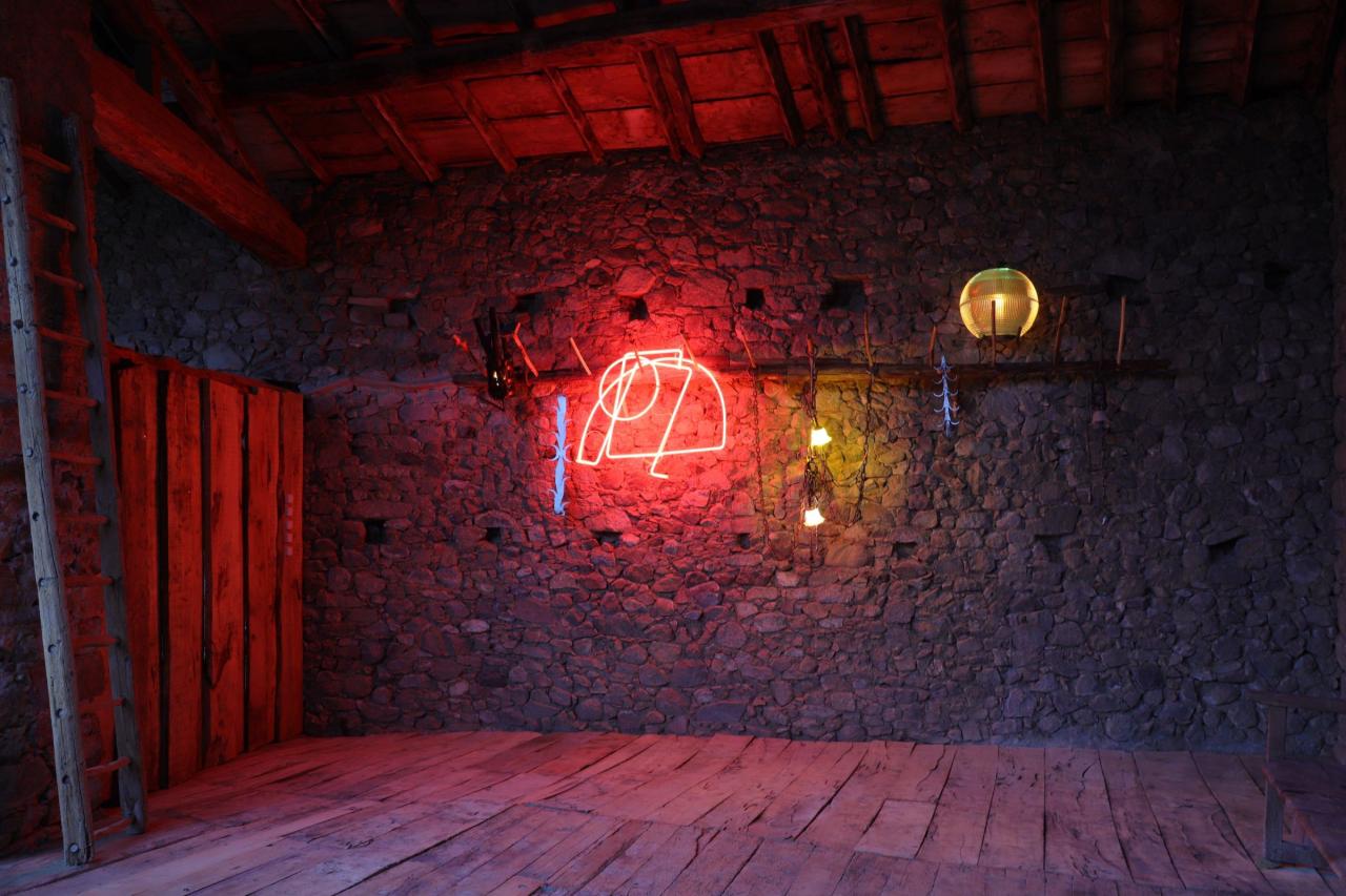 Boire à sa lumière, 2025, site specific permanent installation, light elements assembly, neons, lamps, fake fire, old rack systems, wood structure, independant switches, Entorns, in Musser, Spain, 2025, details, photos Iris Humm