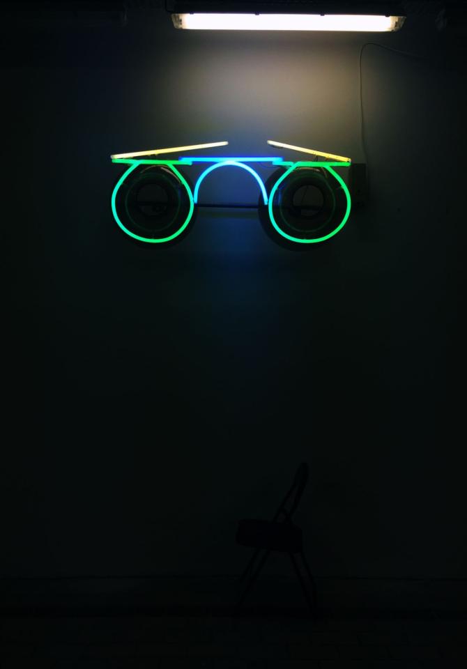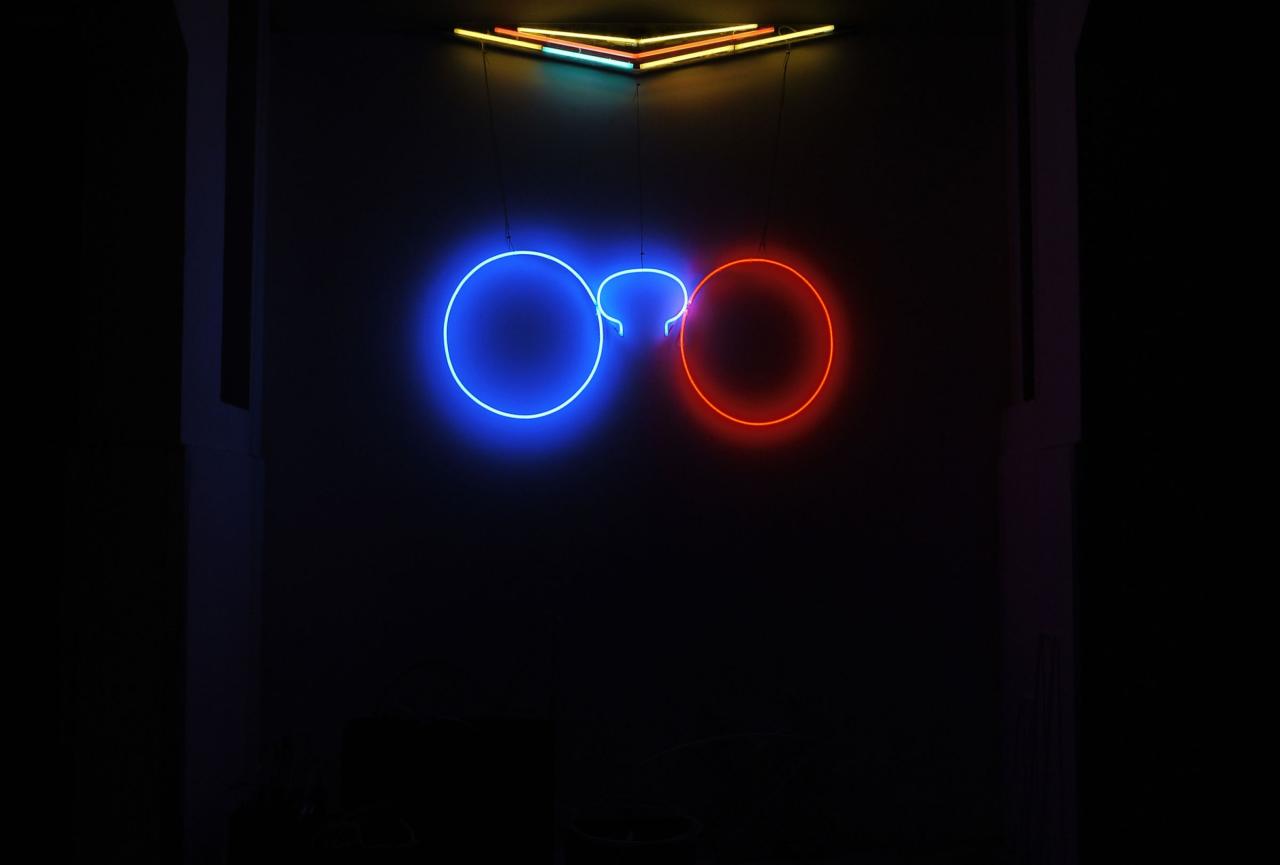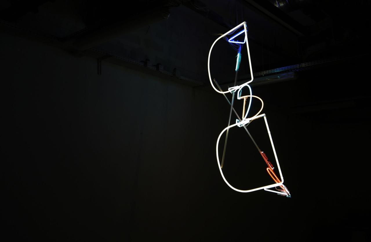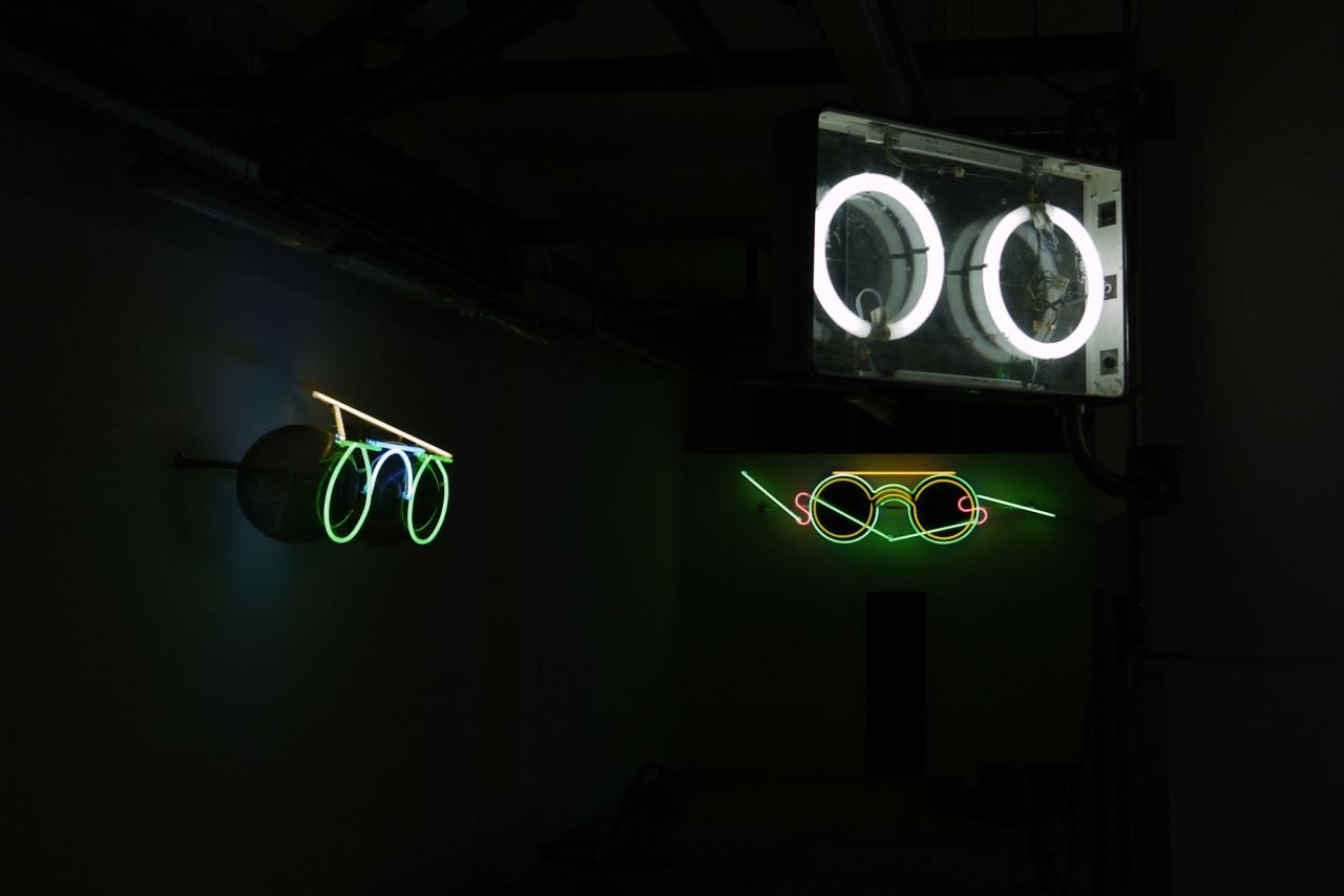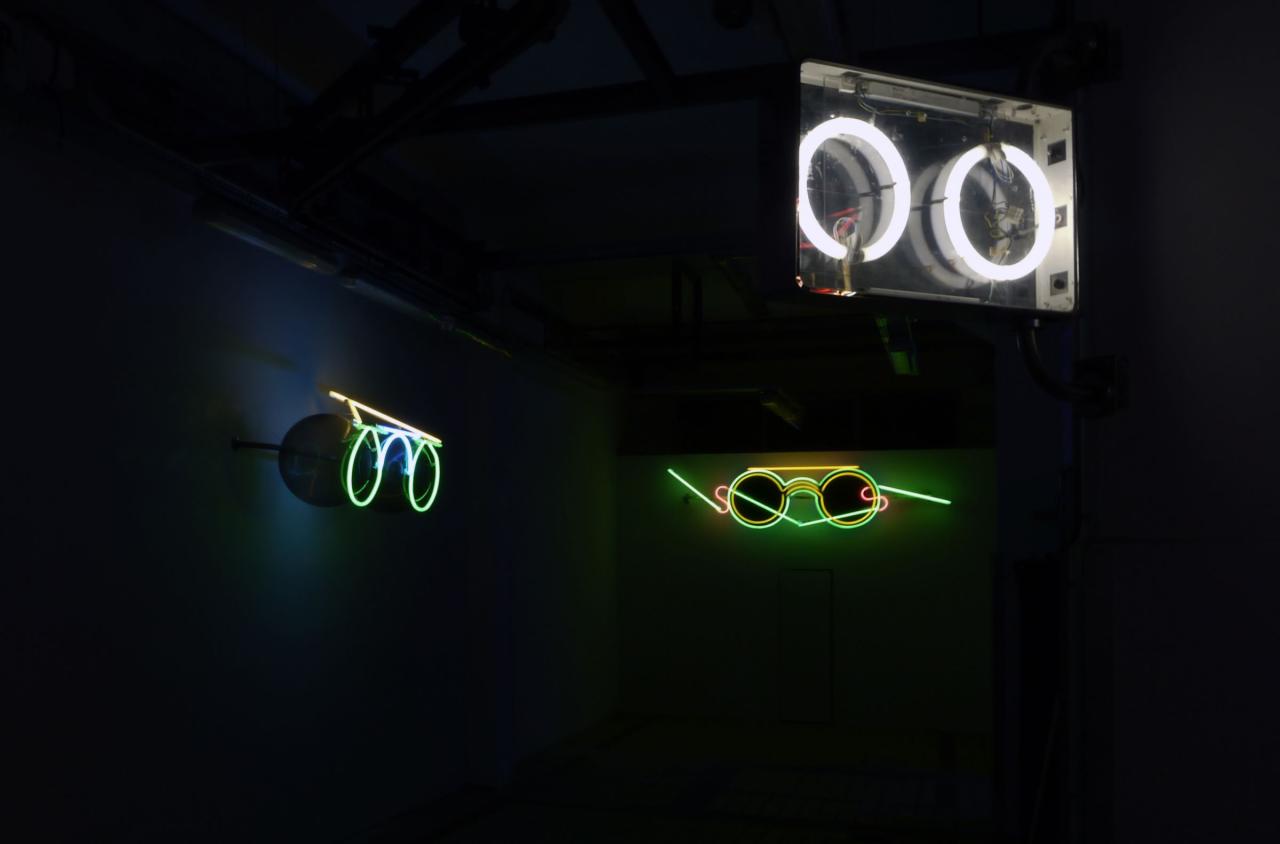 Pour Sho-oter, ses sculptures lumineuses, réalisées durant sa résidence avec le soutien de l’entreprise Atomic Néon, utilisent les codes publicitaires pour mieux les invalider. Dans ce contexte, Rémi Groussin s’est particulièrement intéressé à la forme des lunettes, celle-ci lui permettant de penser l’assemblage à partir d’éléments simples : deux ronds, une barre. De la déconstruction du pictogramme et de ses éléments constitutifs découle une décomposition de la représentation schématique : la fonction du néon bascule dès lors dans le champ sculptural, le signe disparaissant au profit de la forme. Dans cette recherche processuelle, chacune des spécificités techniques de l’objet se trouve décortiquée : lumière, structure, gaz, mais également tension électrique, système d’accroche …