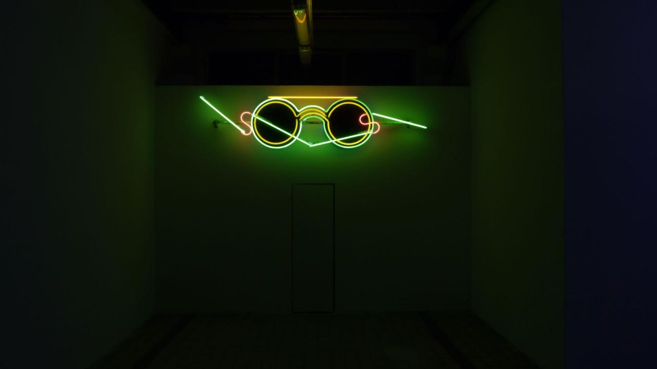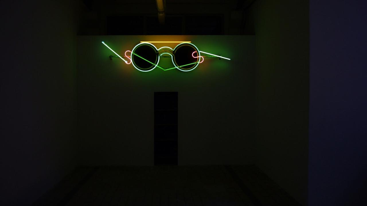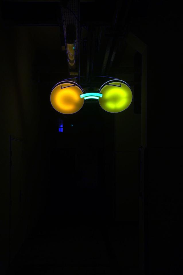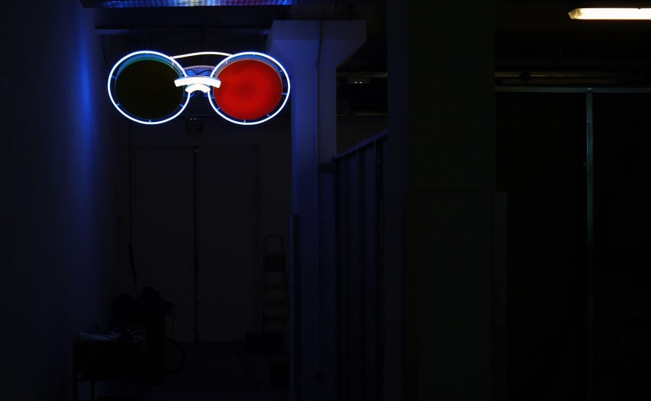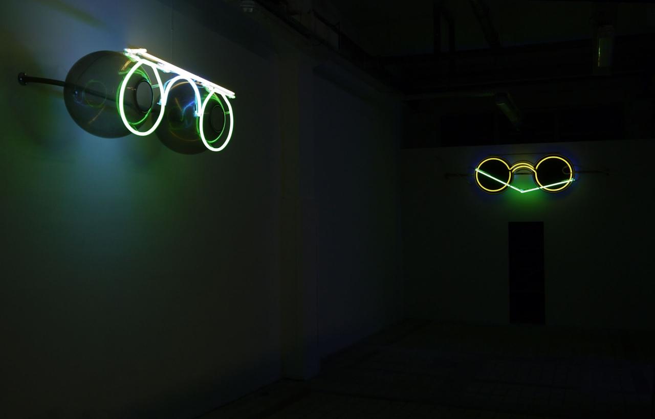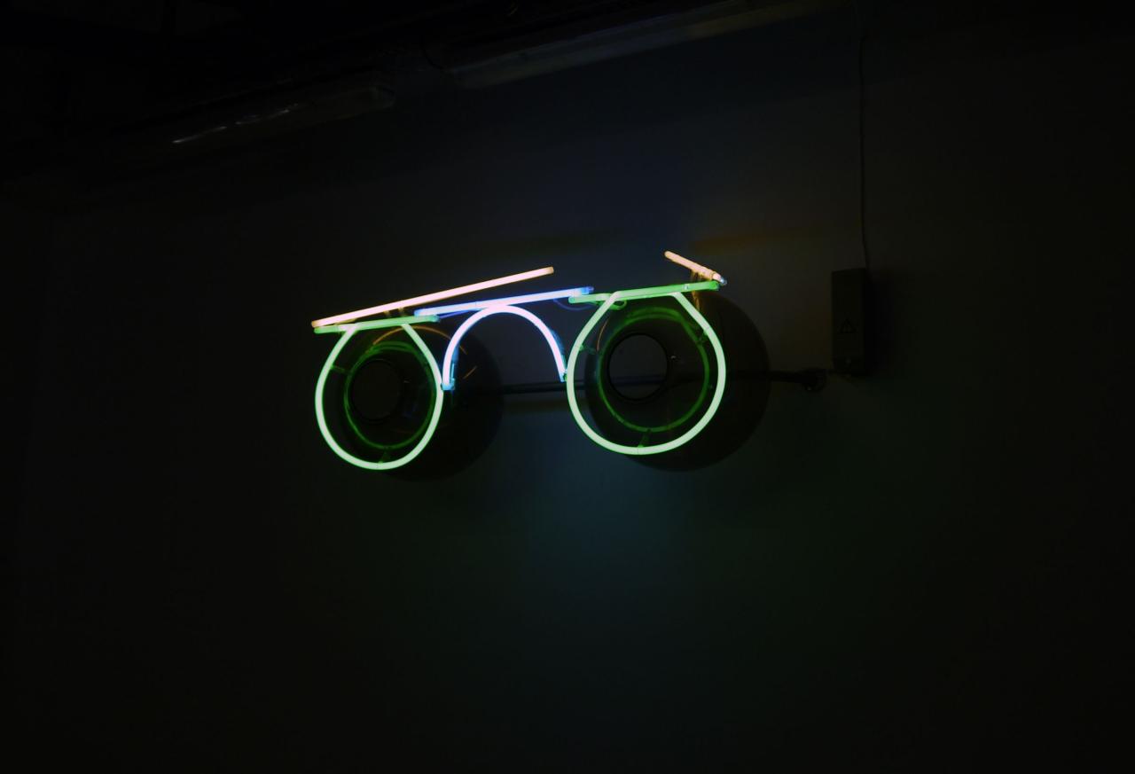 Pour Sho-oter, ses sculptures lumineuses, réalisées durant sa résidence avec le soutien de l’entreprise Atomic Néon, utilisent les codes publicitaires pour mieux les invalider. Dans ce contexte, Rémi Groussin s’est particulièrement intéressé à la forme des lunettes, celle-ci lui permettant de penser l’assemblage à partir d’éléments simples : deux ronds, une barre. De la déconstruction du pictogramme et de ses éléments constitutifs découle une décomposition de la représentation schématique : la fonction du néon bascule dès lors dans le champ sculptural, le signe disparaissant au profit de la forme. Dans cette recherche processuelle, chacune des spécificités techniques de l’objet se trouve décortiquée : lumière, structure, gaz, mais également tension électrique, système d’accroche …