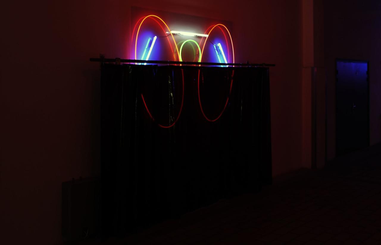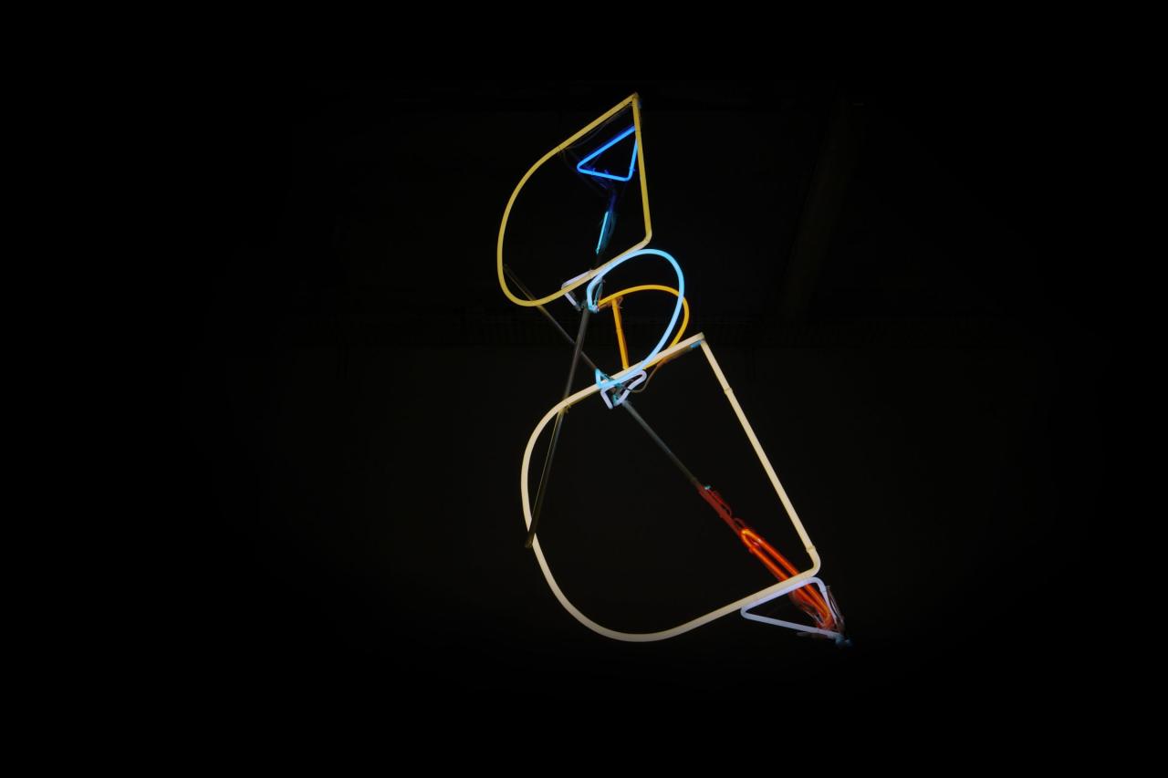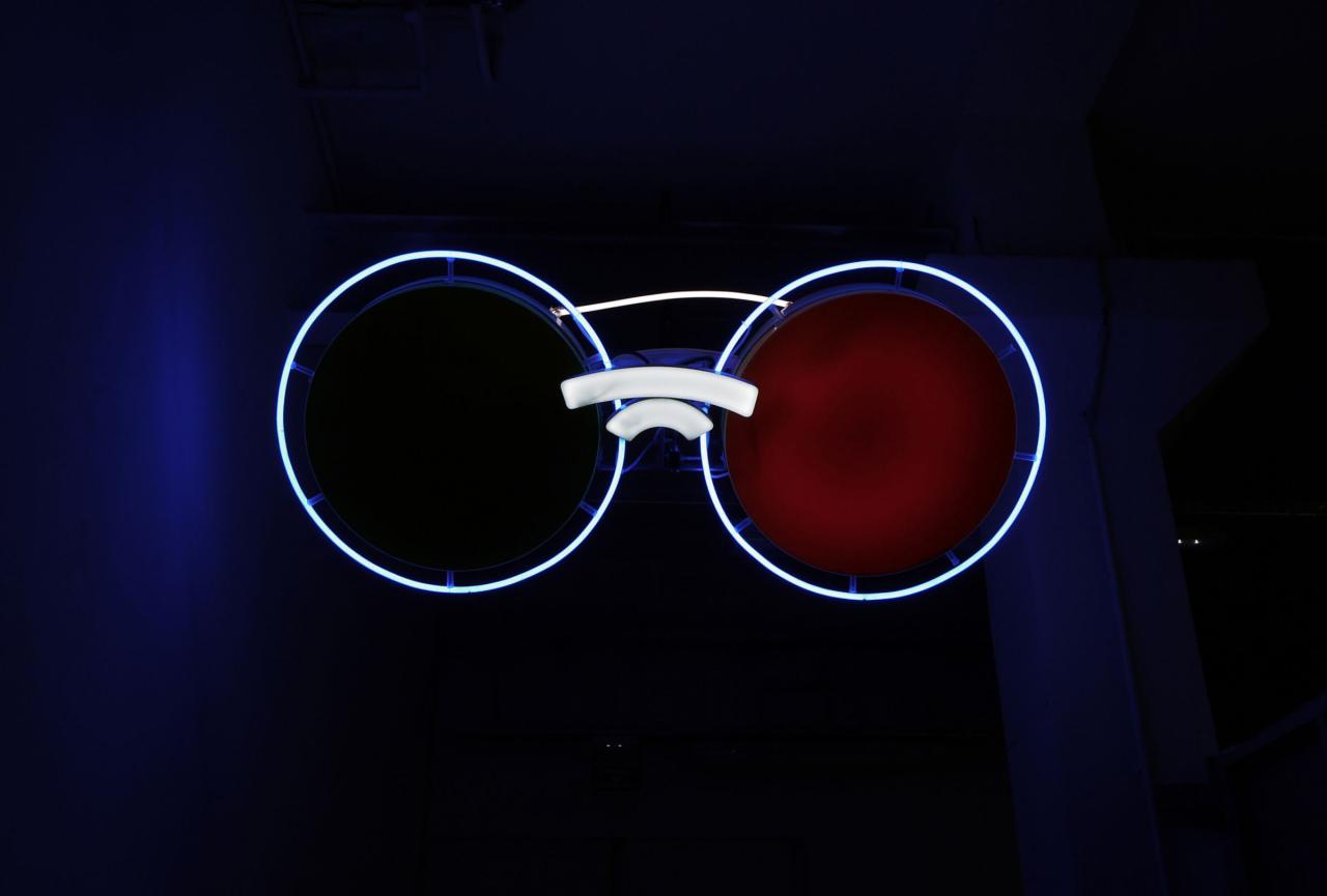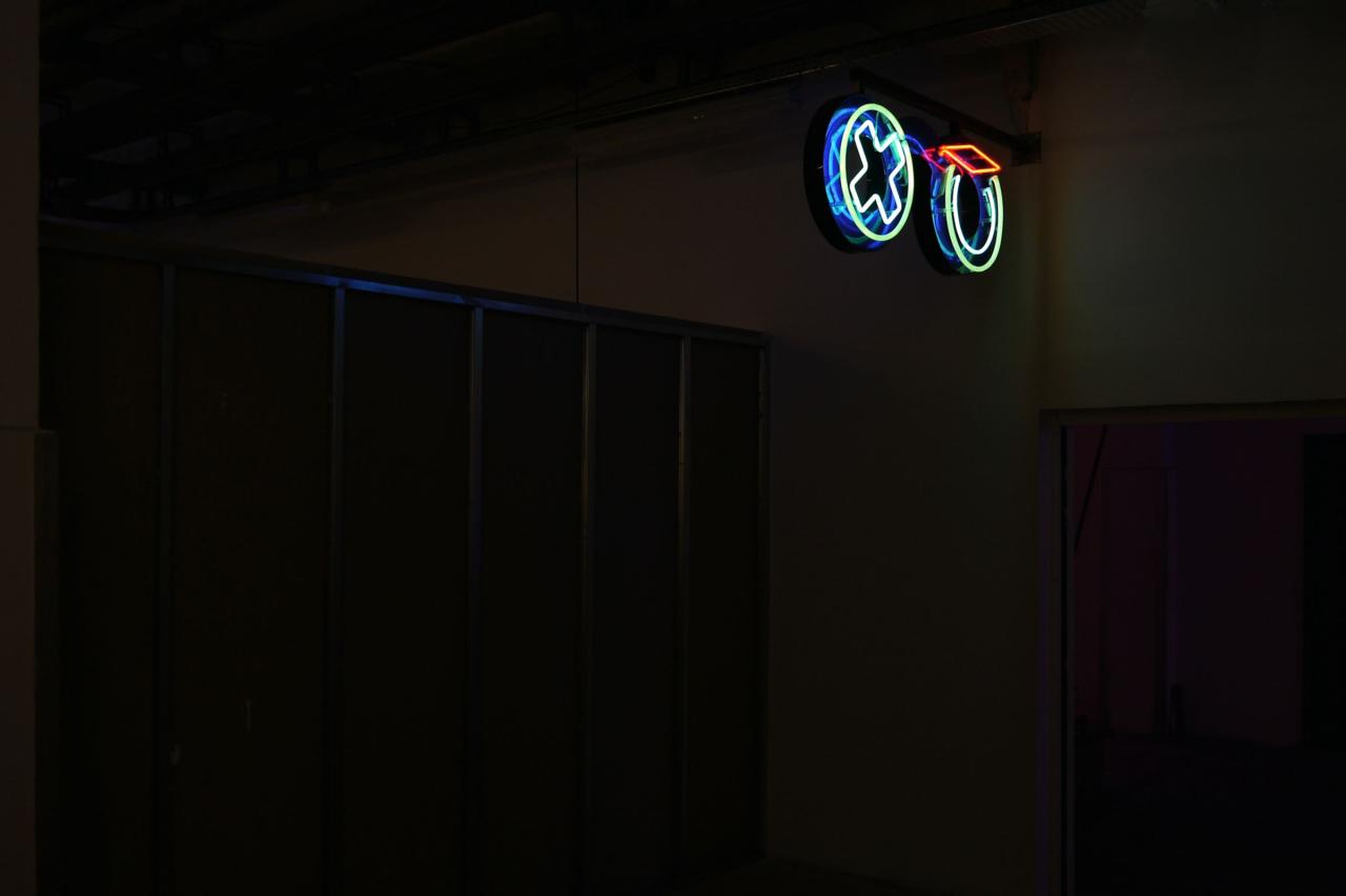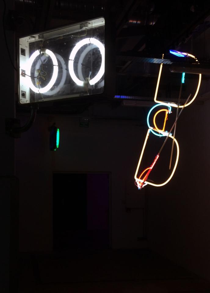 Pour Sho-oter, ses sculptures lumineuses, réalisées durant sa résidence avec le soutien de l’entreprise Atomic Néon, utilisent les codes publicitaires pour mieux les invalider. Dans ce contexte, Rémi Groussin s’est particulièrement intéressé à la forme des lunettes, celle-ci lui permettant de penser l’assemblage à partir d’éléments simples : deux ronds, une barre. De la déconstruction du pictogramme et de ses éléments constitutifs découle une décomposition de la représentation schématique : la fonction du néon bascule dès lors dans le champ sculptural, le signe disparaissant au profit de la forme. Dans cette recherche processuelle, chacune des spécificités techniques de l’objet se trouve décortiquée : lumière, structure, gaz, mais également tension électrique, système d’accroche …