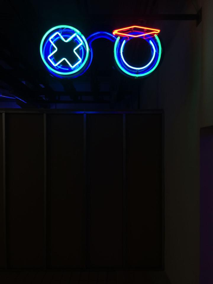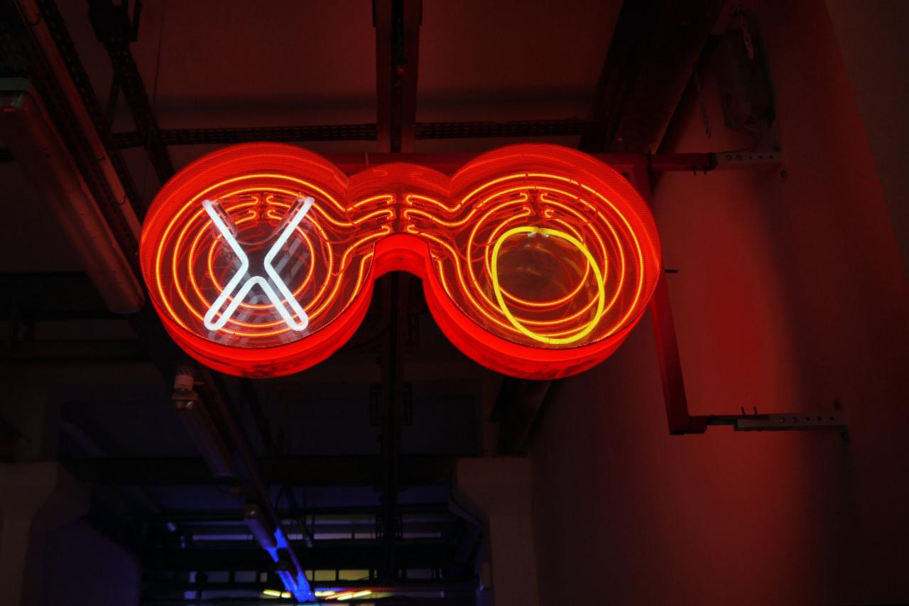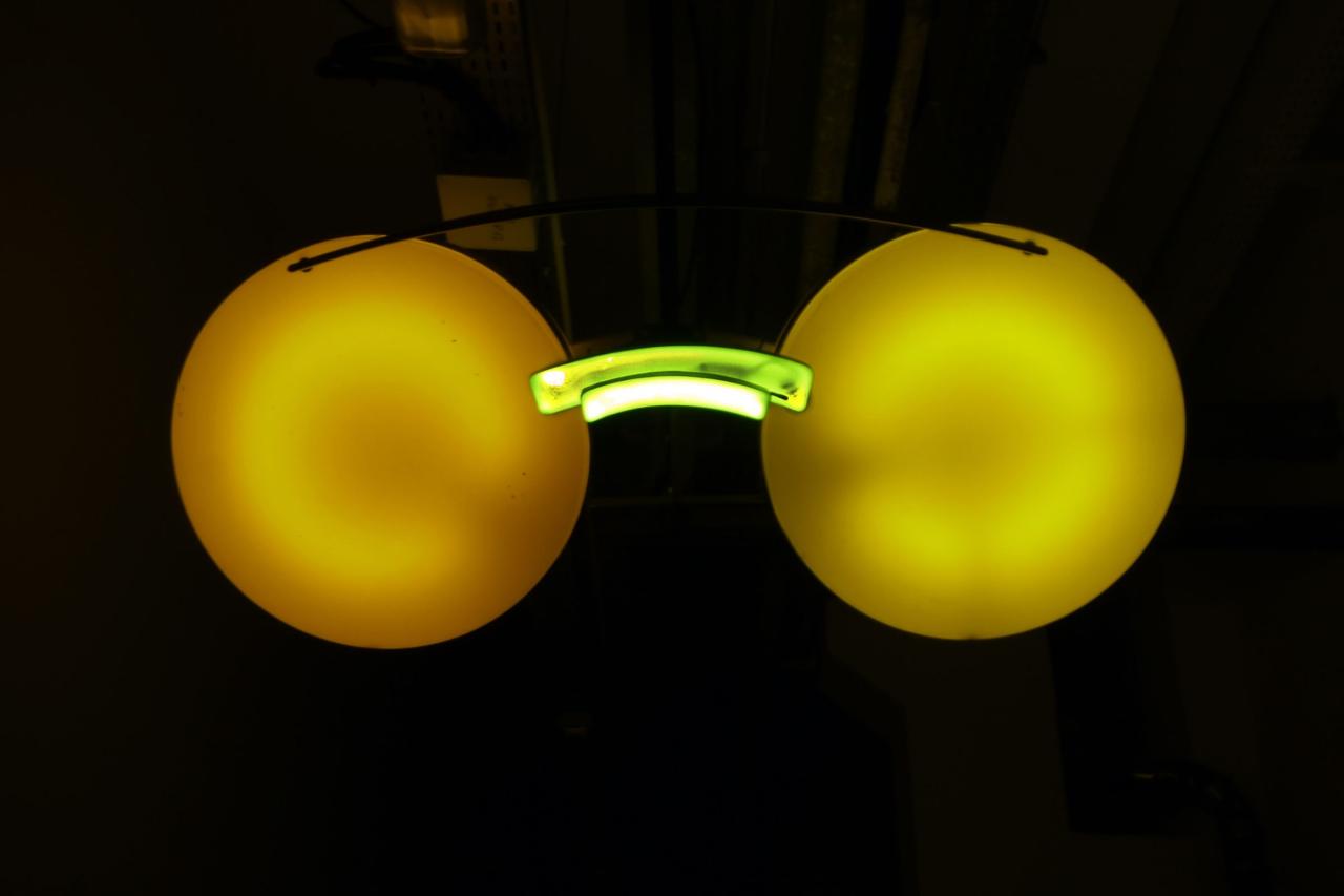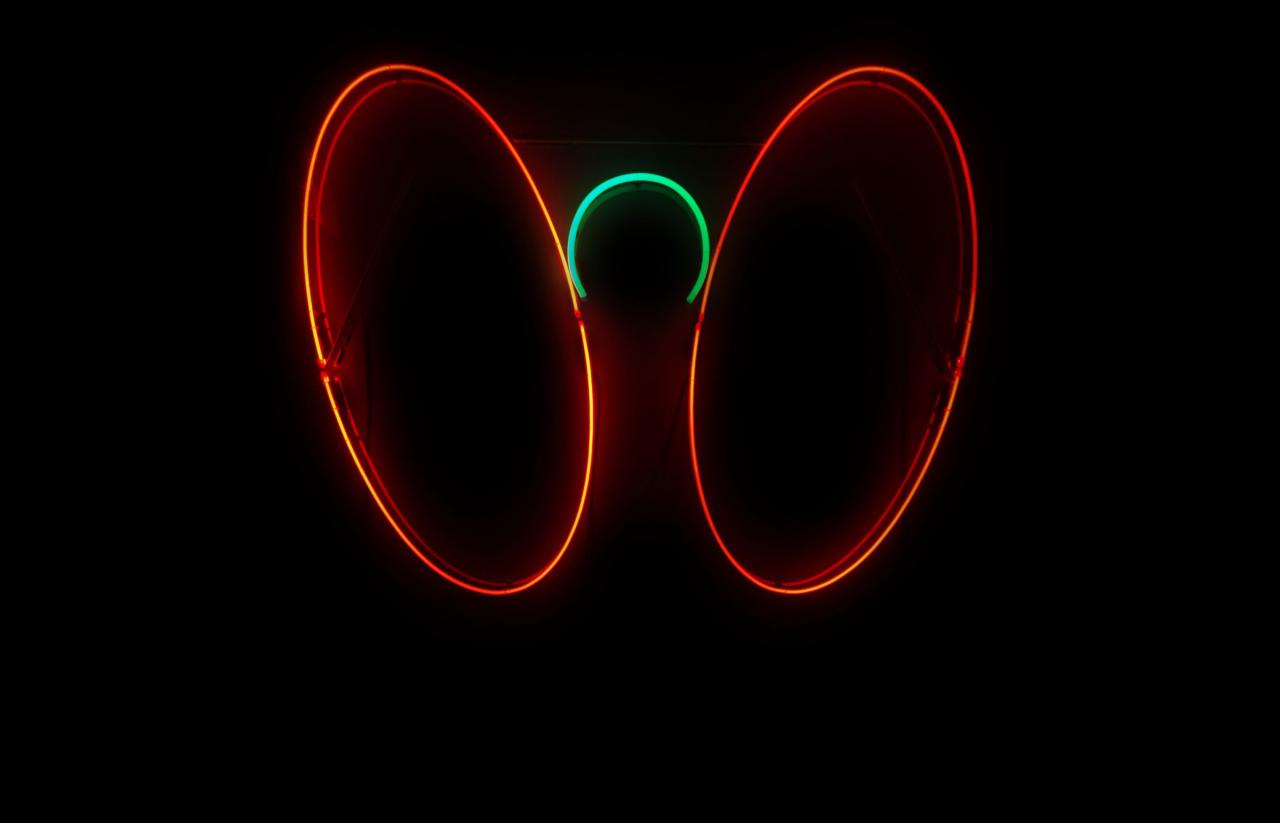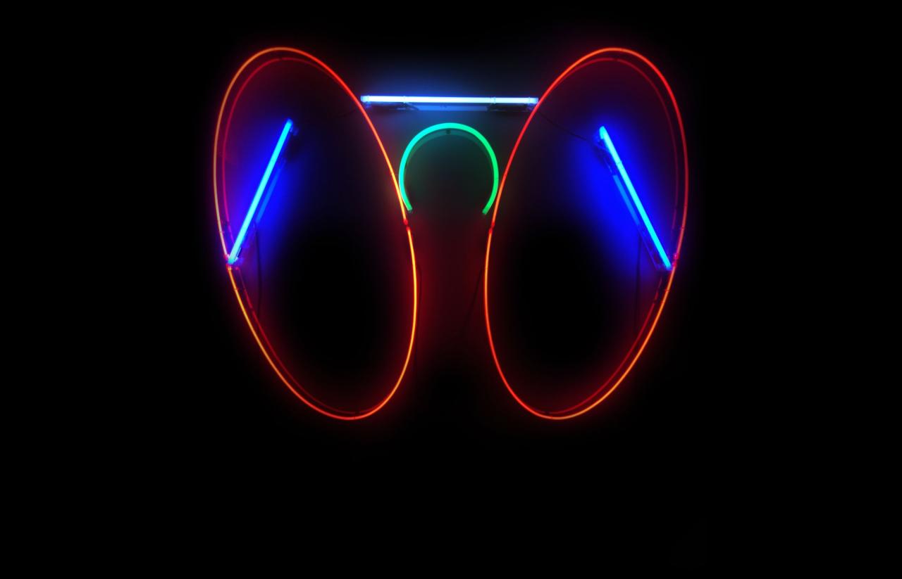 Pour Sho-oter, ses sculptures lumineuses, réalisées durant sa résidence avec le soutien de l’entreprise Atomic Néon, utilisent les codes publicitaires pour mieux les invalider. Dans ce contexte, Rémi Groussin s’est particulièrement intéressé à la forme des lunettes, celle-ci lui permettant de penser l’assemblage à partir d’éléments simples : deux ronds, une barre. De la déconstruction du pictogramme et de ses éléments constitutifs découle une décomposition de la représentation schématique : la fonction du néon bascule dès lors dans le champ sculptural, le signe disparaissant au profit de la forme. Dans cette recherche processuelle, chacune des spécificités techniques de l’objet se trouve décortiquée : lumière, structure, gaz, mais également tension électrique, système d’accroche …