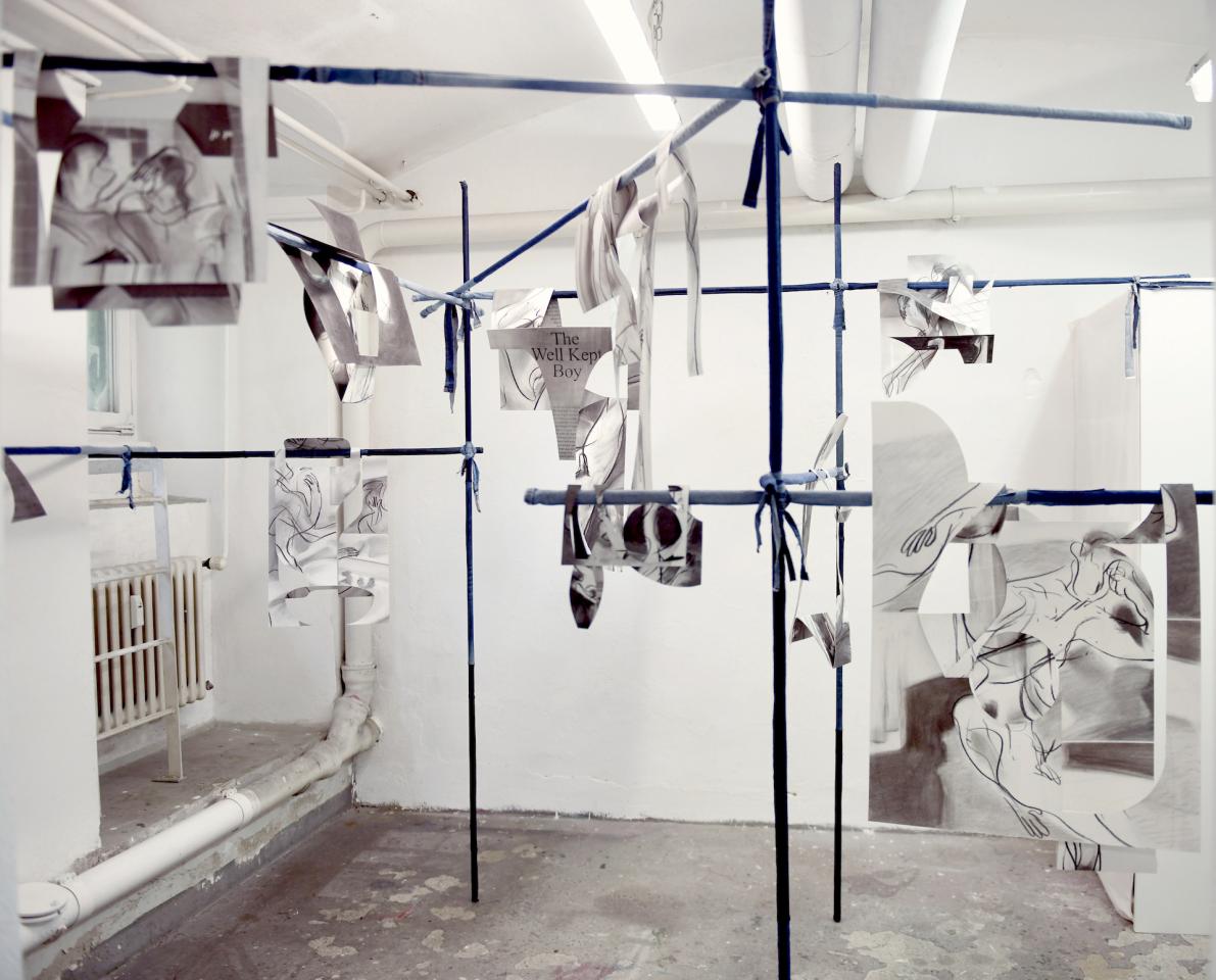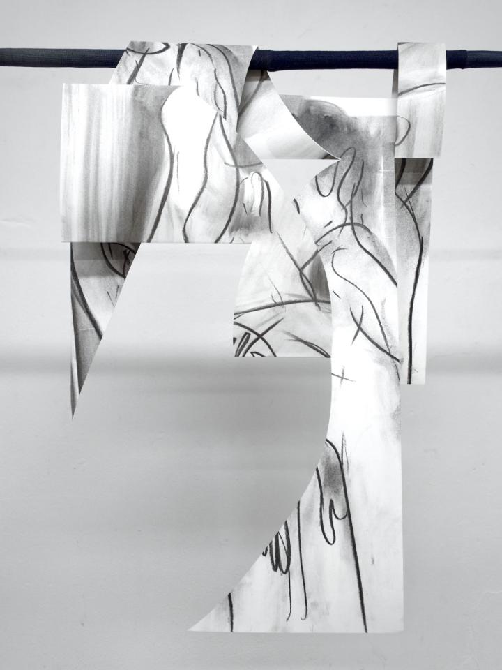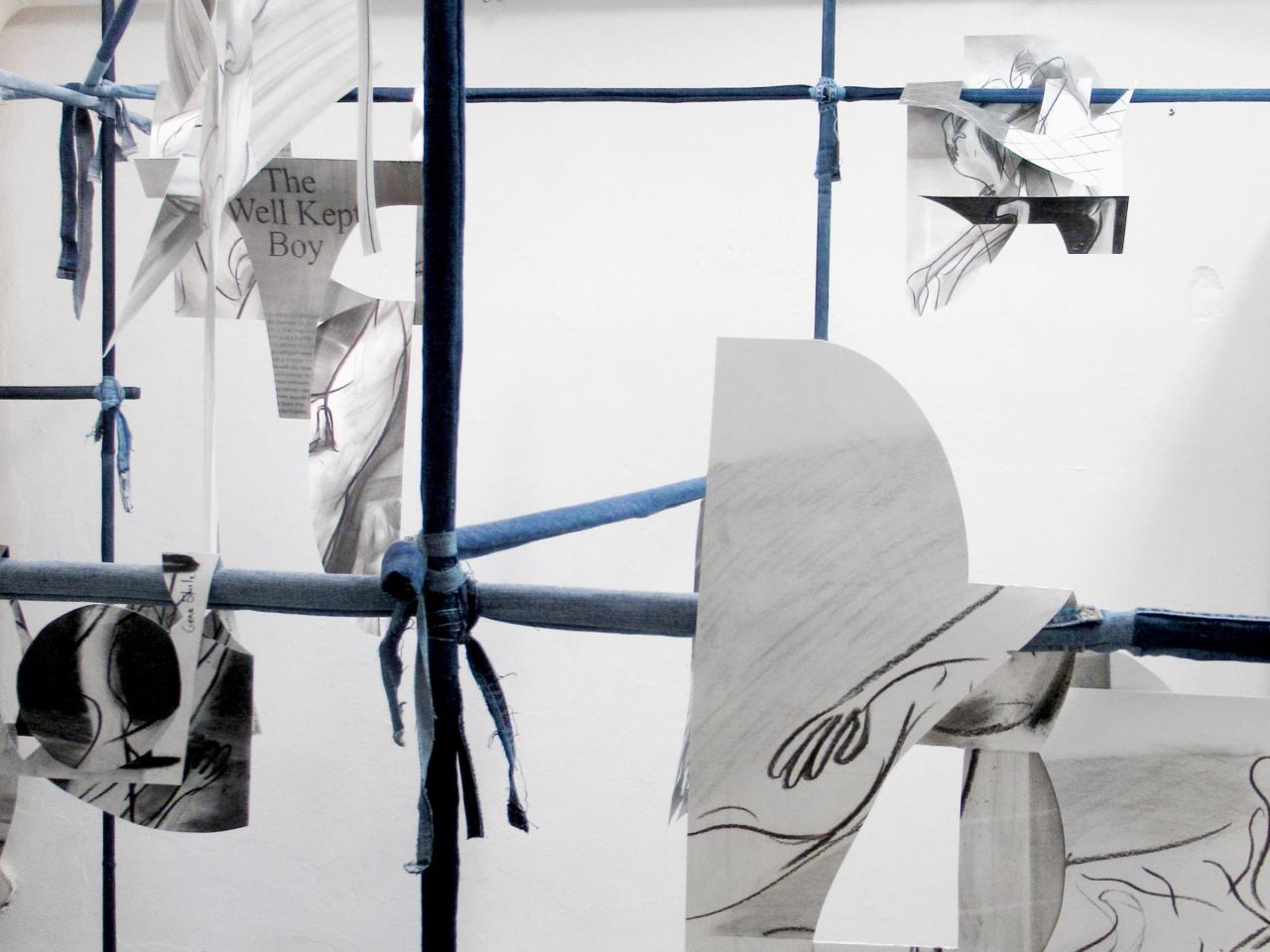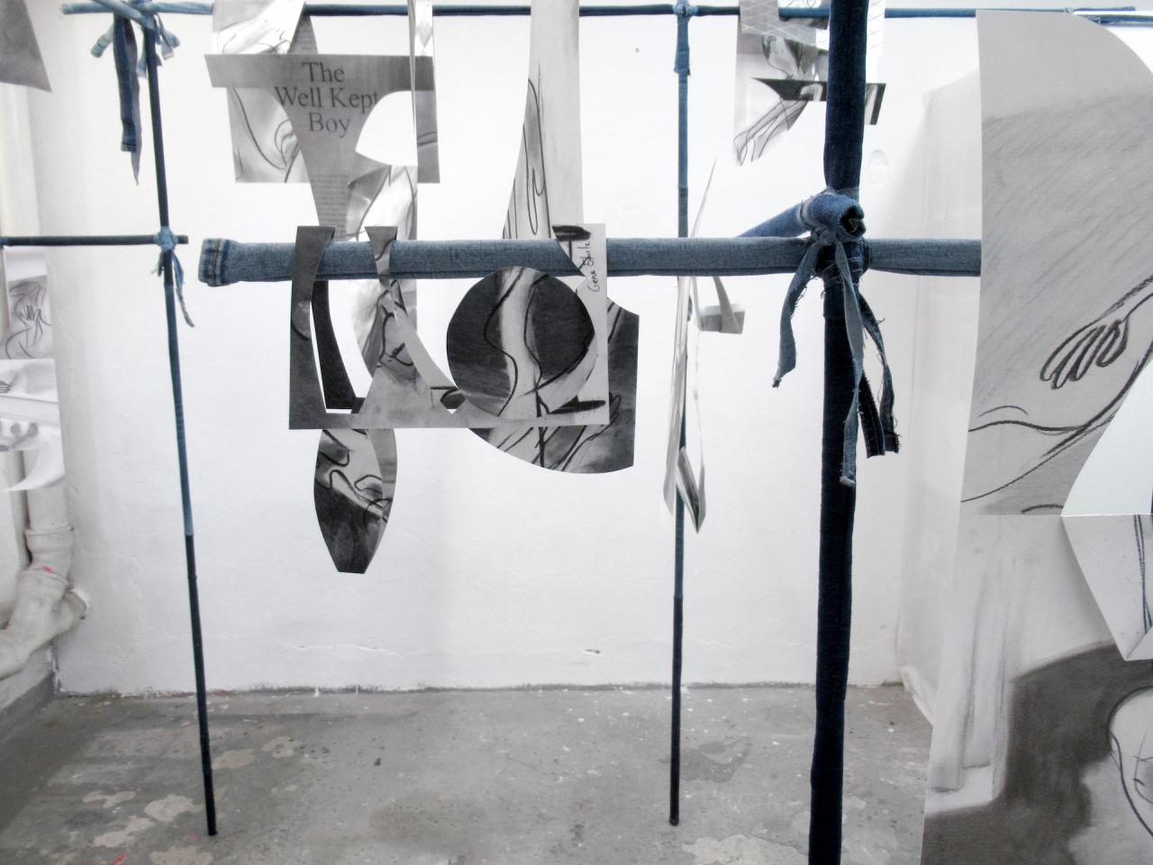 Series of charcoal drawings and acrylic varnish on mounted paper, wooden bar and recycled jeans (tubes and strips)