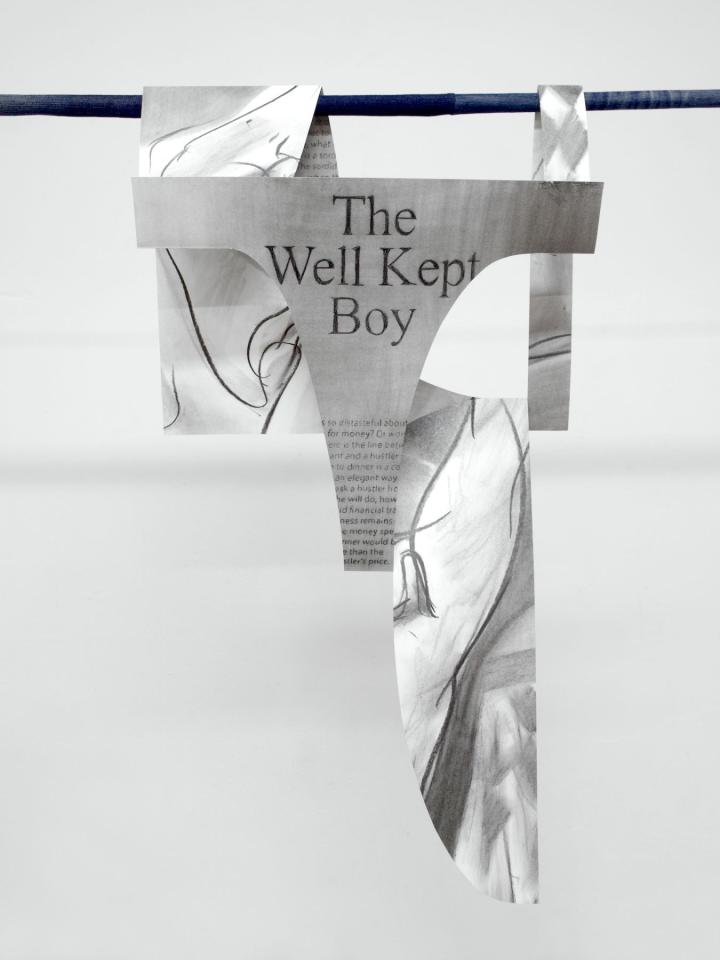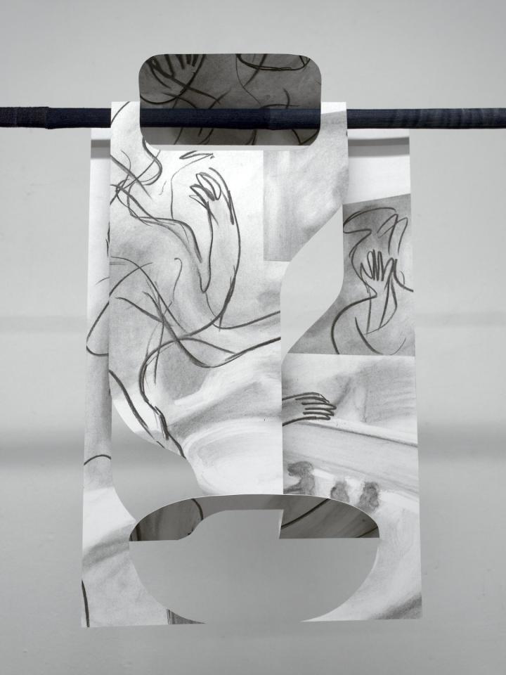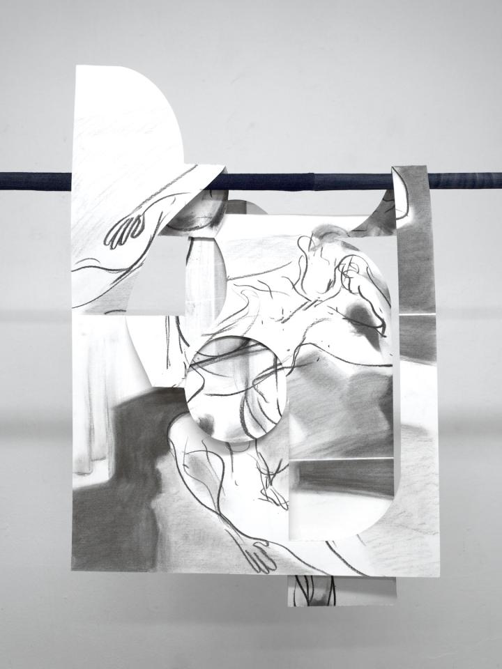 This series of cut-out drawings is inspired by pages from male bodybuilding magazines (known as beefcake magazine). These magazines are at the origin of a gay culture based on the reification of certain types of masculinity that are dominant and characteristic of patriarchy: strength, prowess, domination. But these magazines have initiated a form of disidentification, that is, a simultaneous identification with the masculinity represented and yet the use of this masculinity for homoerotic purposes and interests, contrary to the clearly heteronormative objectives of most bodybuilding magazines. The charcoal lines and cut-outs dissolve the image of the strong, muscular male body in favour of more flexible bodies. This process is a way for me to subvert normative representations of the body and desire.