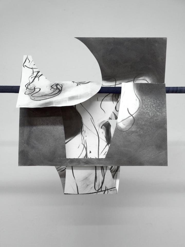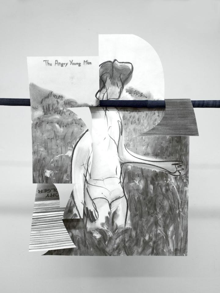 Sans titre (beefcake n°7), 2022, charcoal and acrylic varnish on mounted paper, 67 x 38 cm, view of the group show Achtung, 2022, Studio K43, Kunstquartier Bethanien, Berlin, Germany