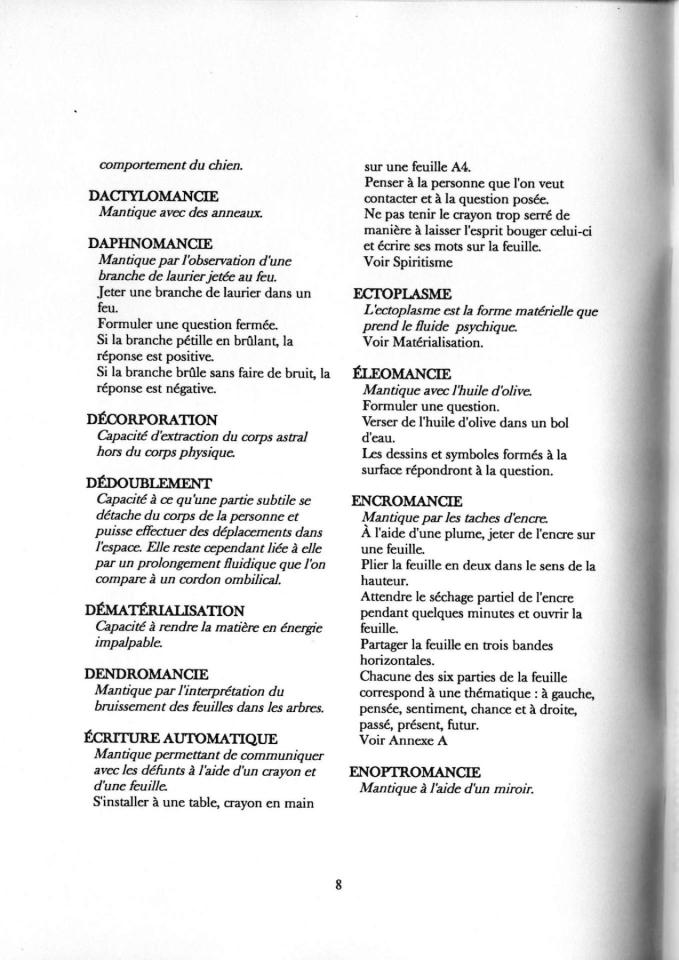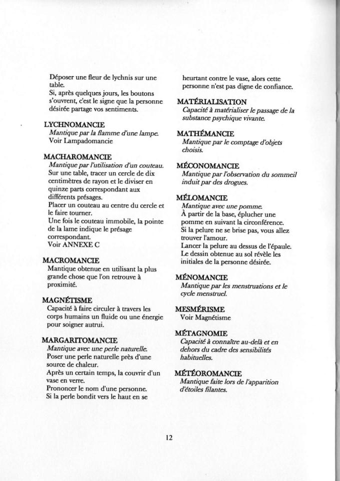 No picture n°4, from which the pages are taken, is a glossary of parapsychological and mantic practices compiled by the artist. Parapsychology studies unexplained phenomena, while mantics encompasses divinatory arts based on tools and processes.