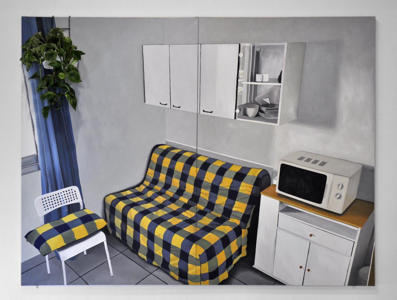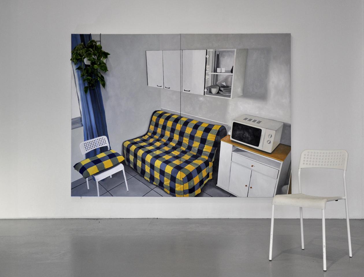 Les peintures et les objets qui sont présentés à Aperto rejoignent ses questionnements sur l’image utilitaire, ces images honnêtes et sans prétention, souvent produites de manière triviale et instinctive. Le tableau apparaît comme un élément qui fabrique la valeur esthétique de ces images qui, dans leur pratique quotidienne, disparaissent dans leur utilisation. La peinture lui permet d’opposer une lenteur à la vitesse fulgurante des flux visuels dont émanent ses images sources. Considérant que chaque image est un objet culturel véhiculé par une technique qui en conditionne la réception, Sam Krack cherche à briser ce conditionnement pour proposer au spectateur un nouveau regard sur un type d’image familier et pourtant étrange.