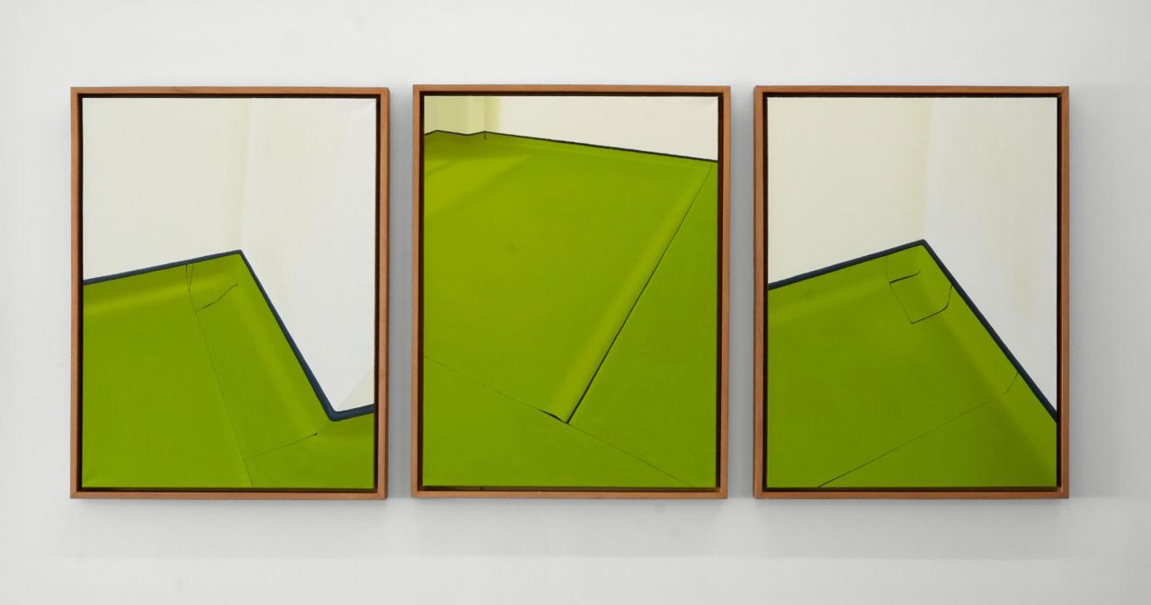 Litige Linoleum (nettle green 1), Litige Linoleum (nettle green 2) et Litige Linoleum (nettle green 3), 2024, huiles sur lin, vue de l’exposition collective Un monde fissuré, 2025, CACN, Nîmes, photo Sandy Korzekwa