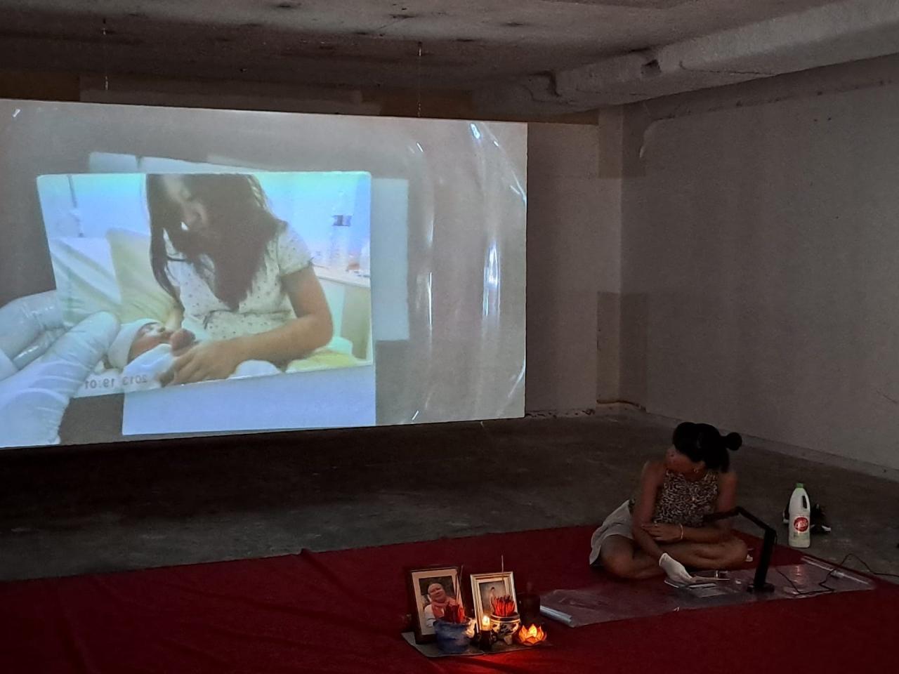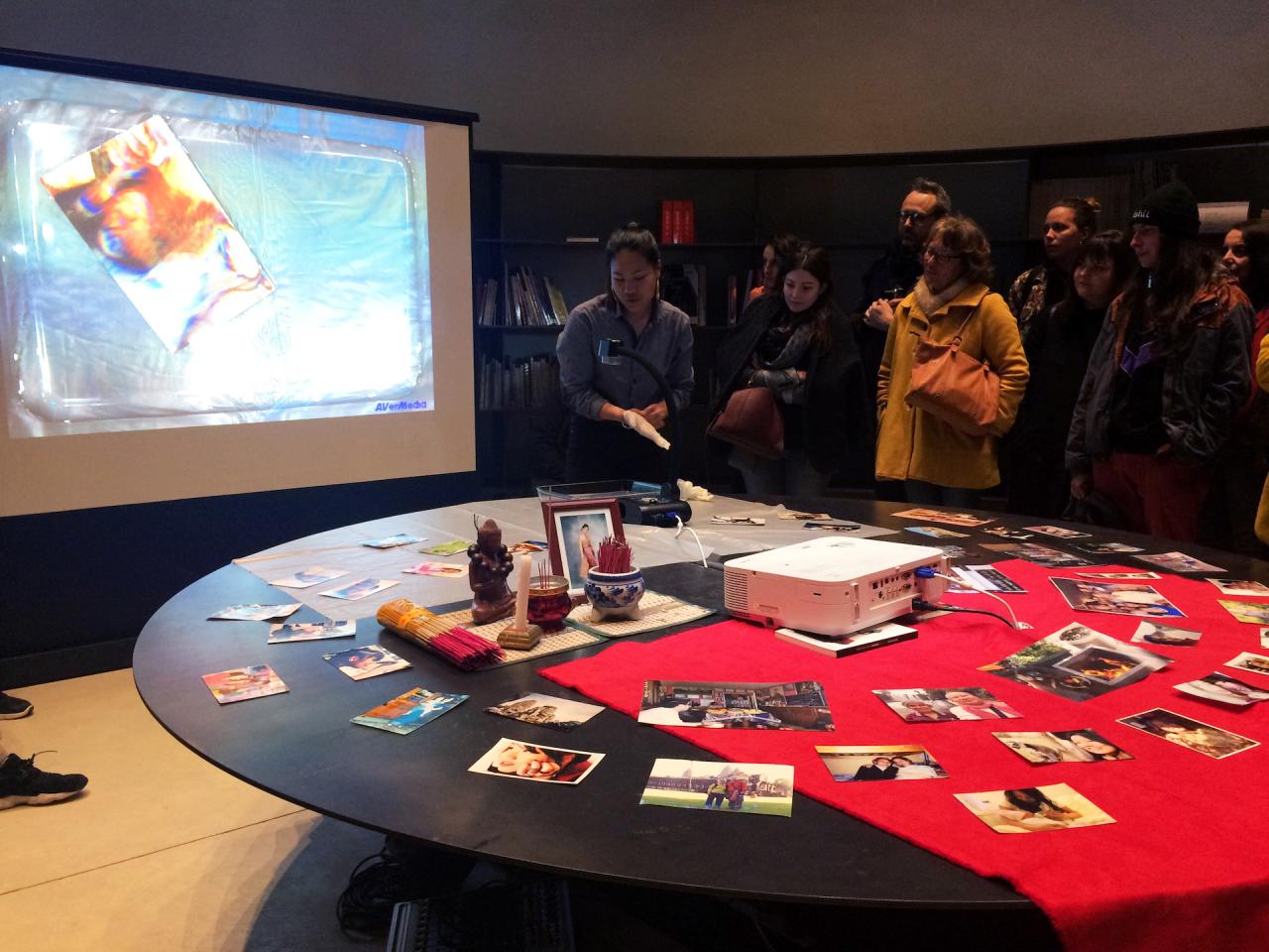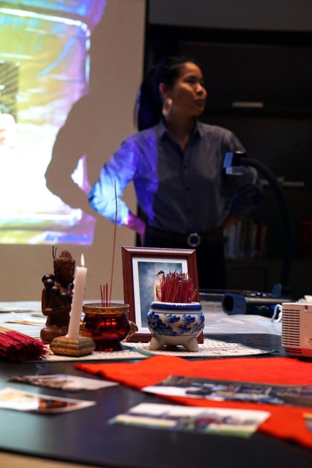 Devant une foule intriguée, soudainement projetée dans l’intimité d’une anonyme, Socheata Aing présente un autel peuplé de photographies par dizaines. Une par une, elle les prend et raconte, aux inconnu·e·s rassemblé·e·s autour d’elle, l’histoire de sa famille par l’anecdote, le décès d’une de ses sœurs , le sourire d’une autre, le lieu ici visité ensemble ; elle pose un nom sur des visages toujours chéris par elle, d’abord étrangers
