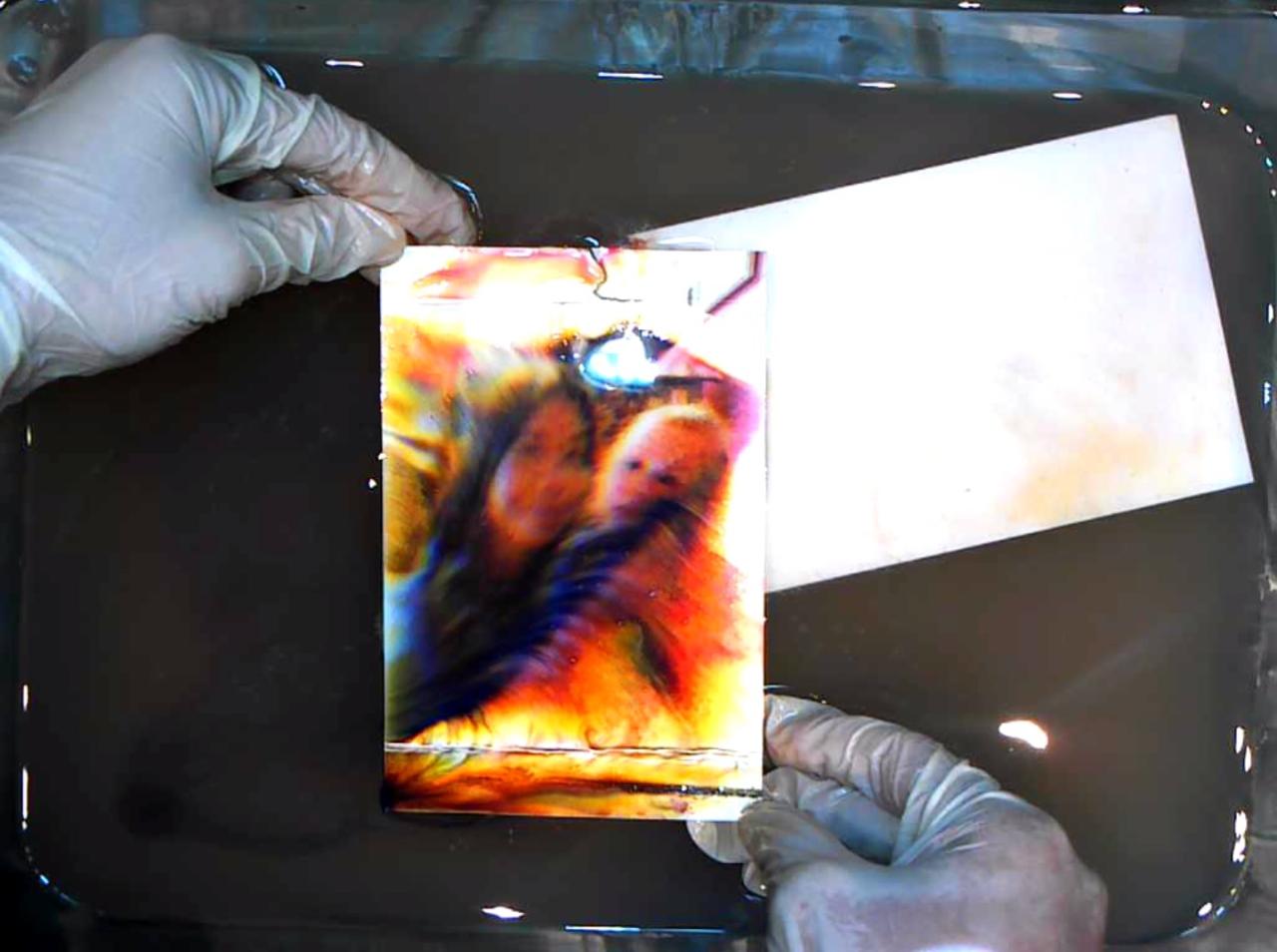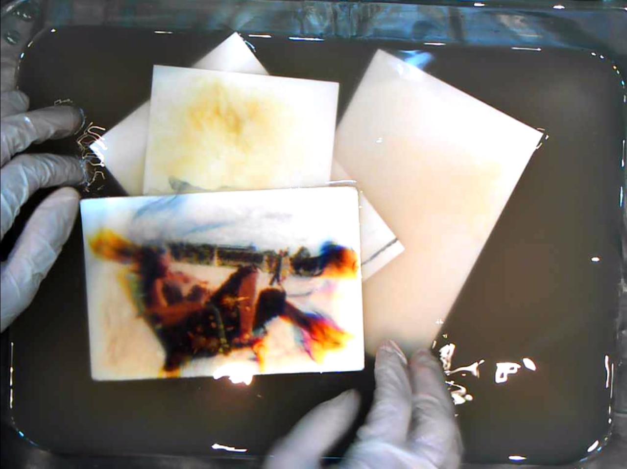 Comment ose-t-elle ? L’apparente profanation se fait dans la douceur la plus extrême. L’image figée d’instants passés à jamais a disparu dans les ondoiements de l’eau trouble ; que reste-t-il du souvenir ? S’est-il enfumé avec son support ?