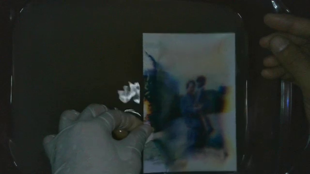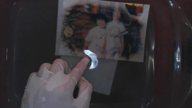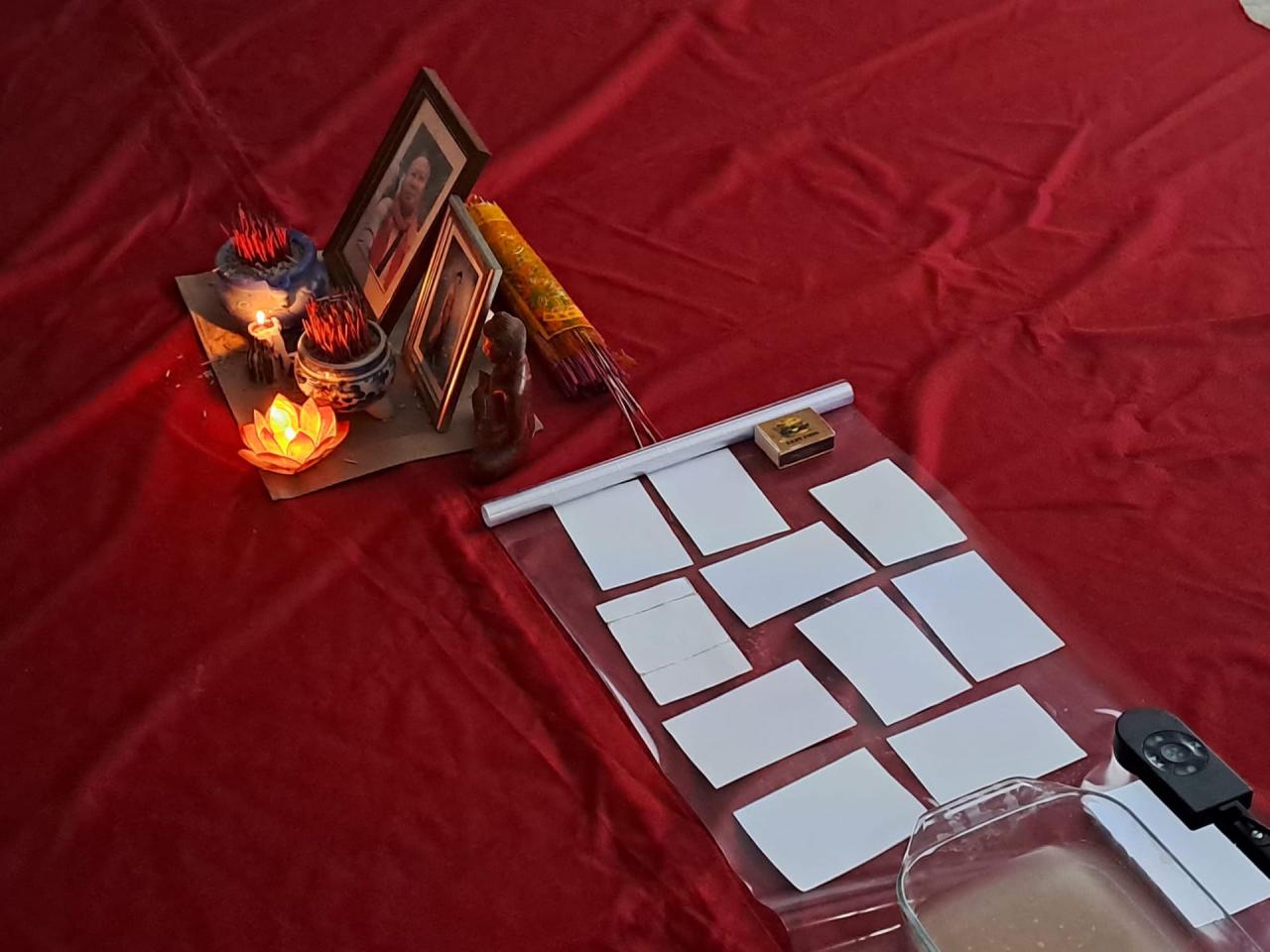 Family photos 10 x 15 cm, bleach, Pyrex dish, episcope and Buddhist altars
