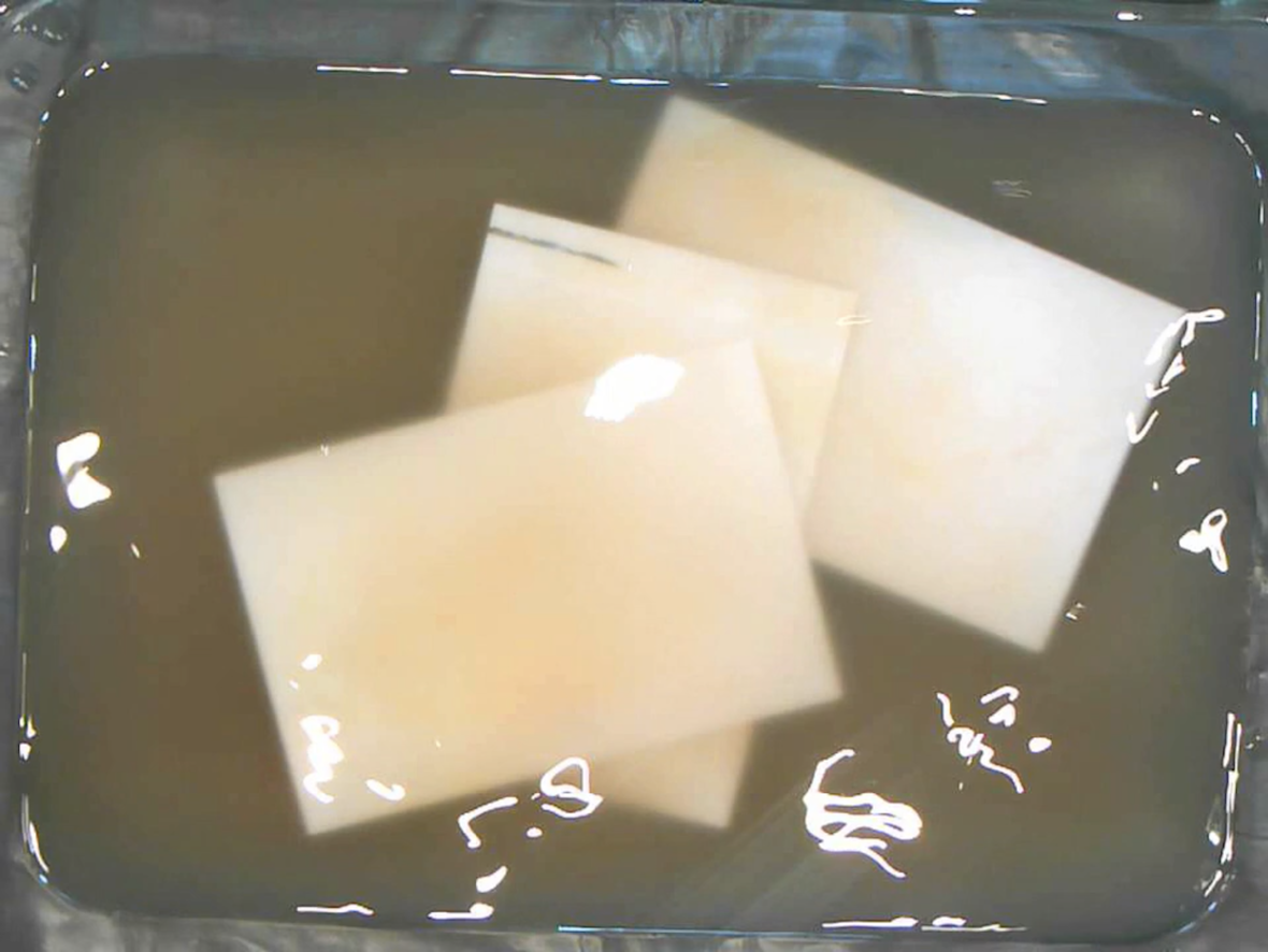 pour les autres, bientôt devenus familiers pour tou·te·s. Et puis, délicatement, dans le bac de javel posé devant elle, elle les lave, une par une, jusqu’à retrouver le blanc mat et neutre du papier photo. Les couleurs se liquéfient jusqu’à fondre complètement, les sourires se noient, les yeux disparaissent.
