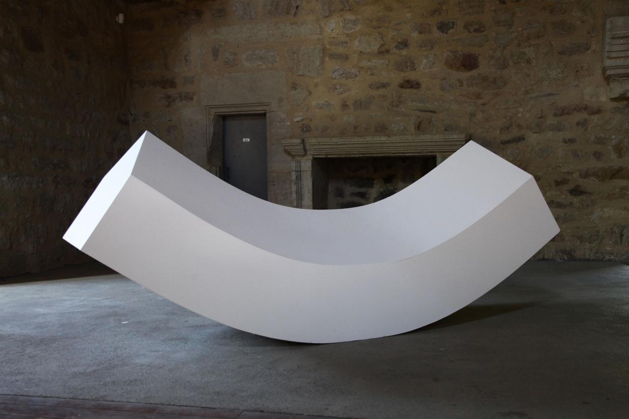 Balancier 1, 2016, contreplaqué peint, vue de l’exposition En orbite dans la tour du Vallon du Villaret, Bagnols-les-Bains, 2016