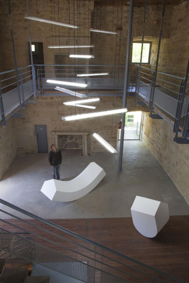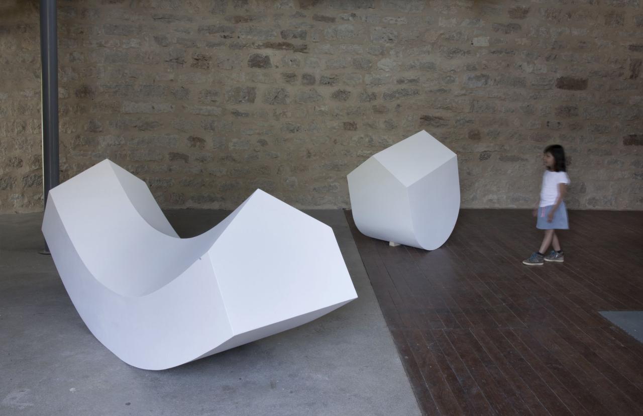 Balancier 1 et 2, 2016, contreplaqué peint, vue de l’exposition En orbite dans la tour du Vallon du Villaret, Bagnols-les-Bains, 2016