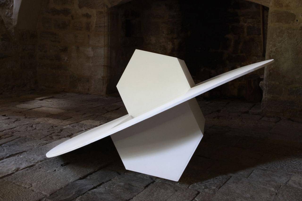 Culbuto 1, 2016, contreplaqué peint, 240 x 240 x 120 cm, vue de l’exposition En orbite dans la tour du Vallon du Villaret, Bagnols-les-Bains