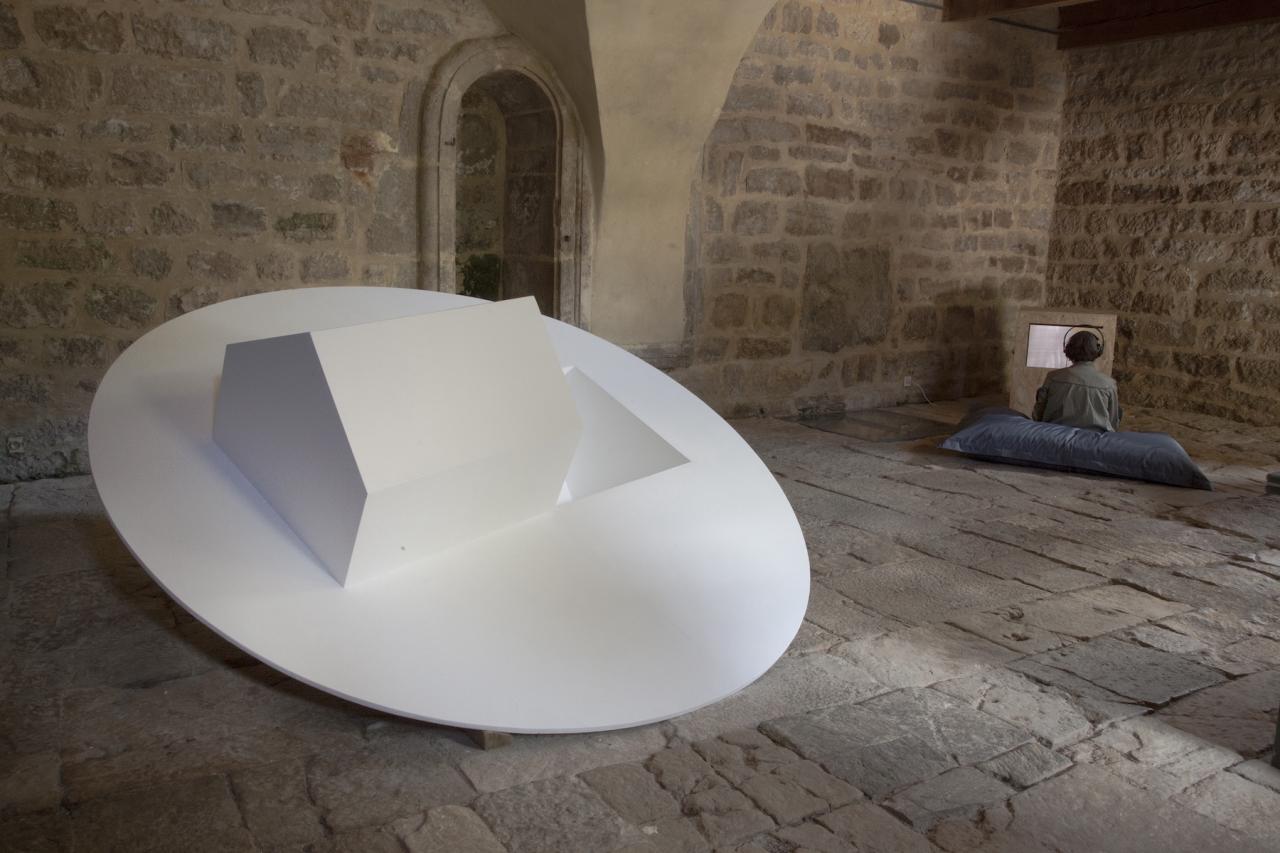 Vue de l’exposition En orbite, dans la tour du Vallon du Villaret, Bagnols-les-Bains