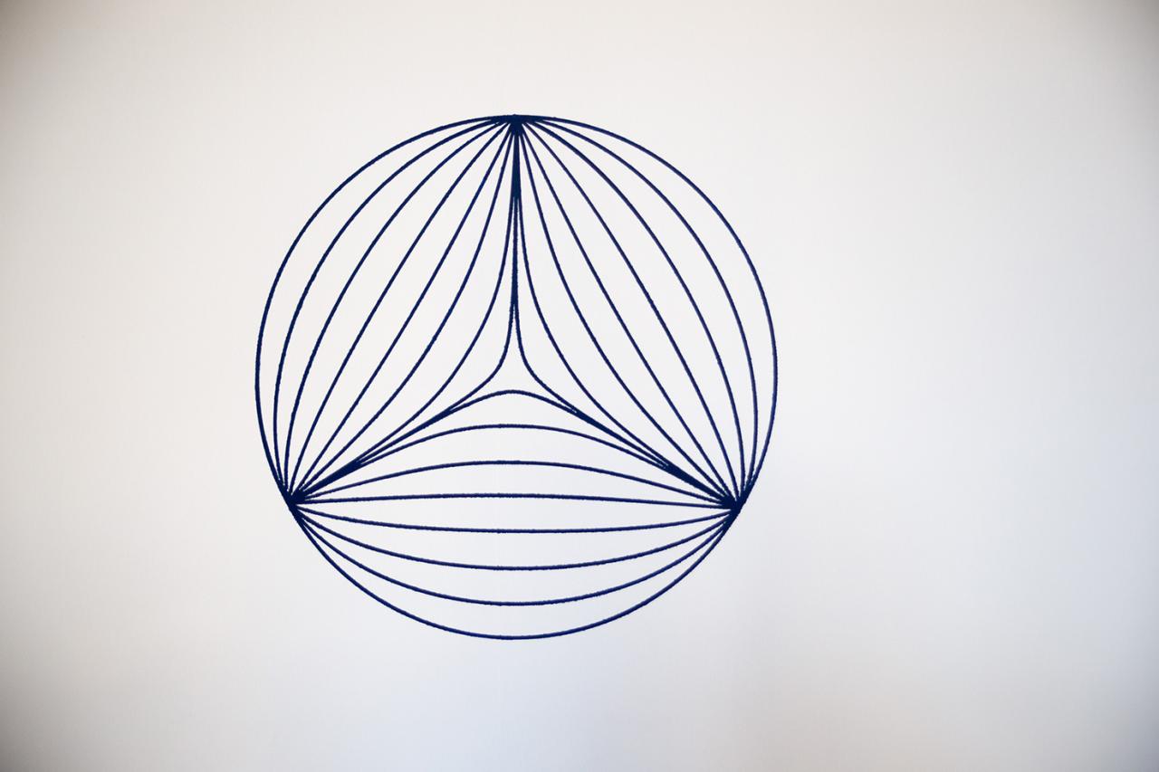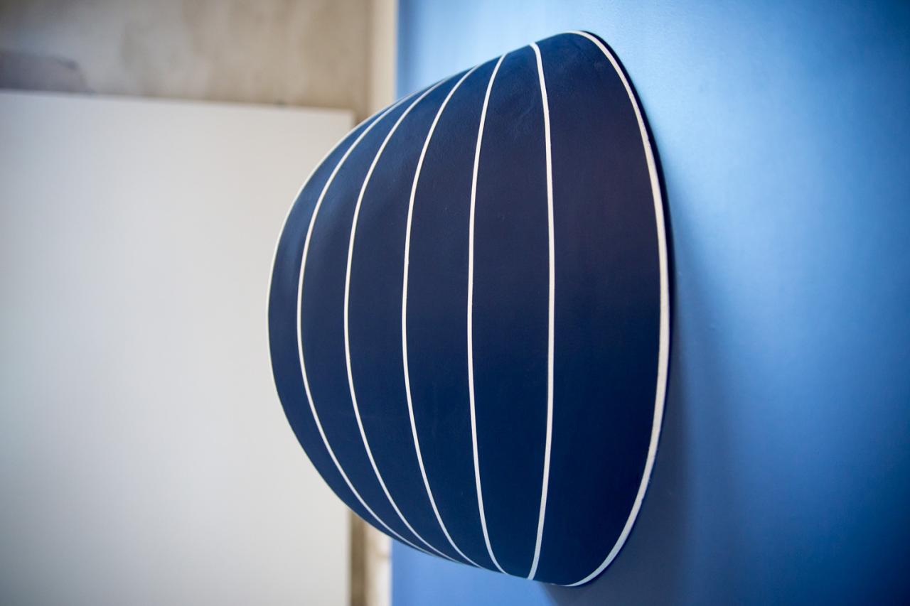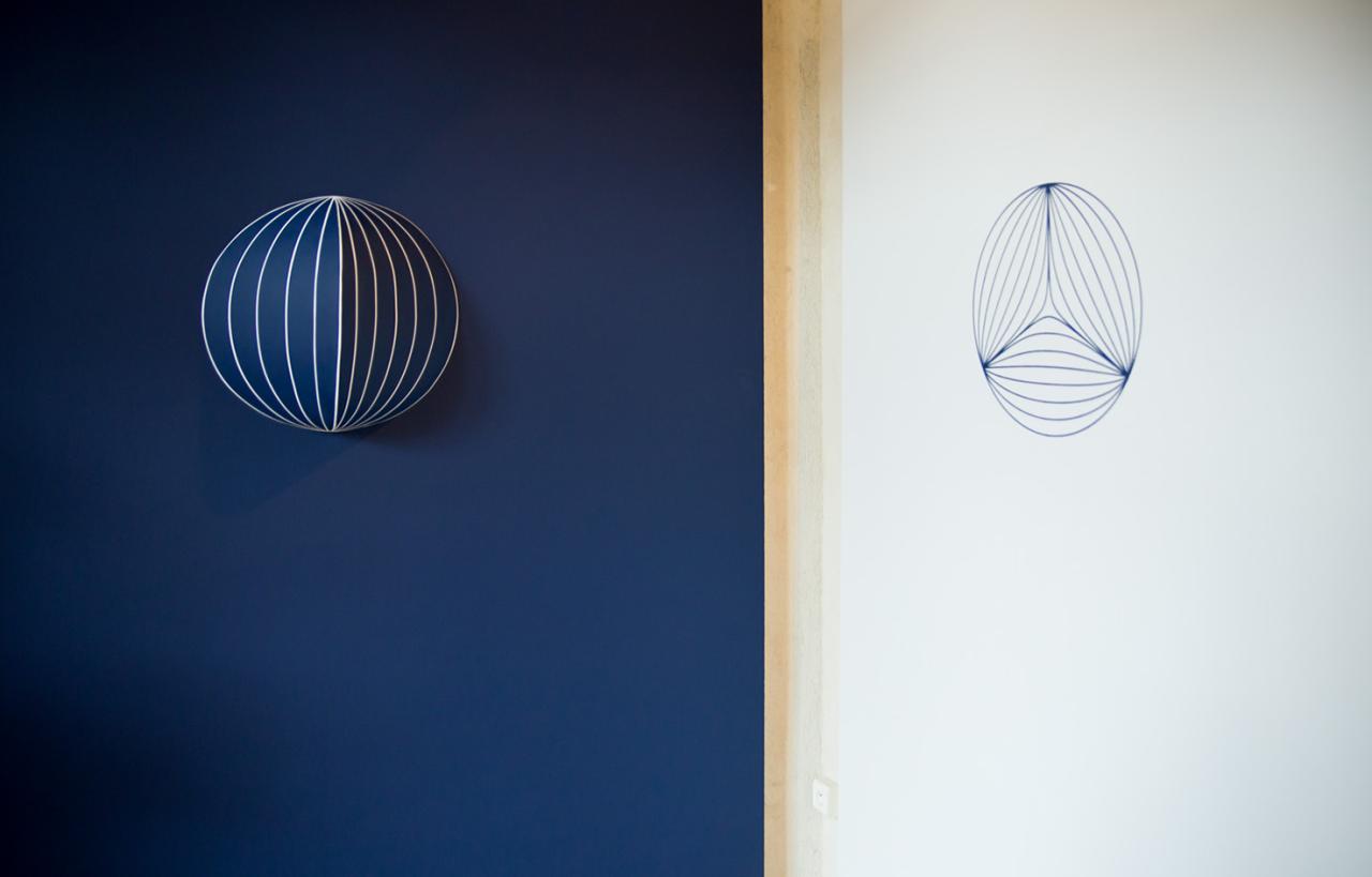De différente échelle, présentée en trois dimensions ou dépliée en planisphère, en creux ou en bosse au mur, la série est ouverte. La multiplicité des points de vue souligne l’impermanence des choses et la possibilité de créer d’autres réalités, au risque de « dérives et de détournements poétiques 1 ». L’univers muni d’une courbure constante et positive n’est-il pas représenté par une sphère à trois dimensions, une hypersphère à la fois finie et illimitée ? De la ligne à la courbe, la série joue sur la plasticité des formes et avec la vibration perceptive, laissant une place importante à l’errance et à l’imaginaire. Tandis que les monochromes bleus, abstraits et symboliques, renvoient immanquablement au céleste et au terrestre.