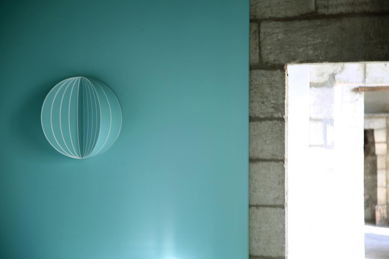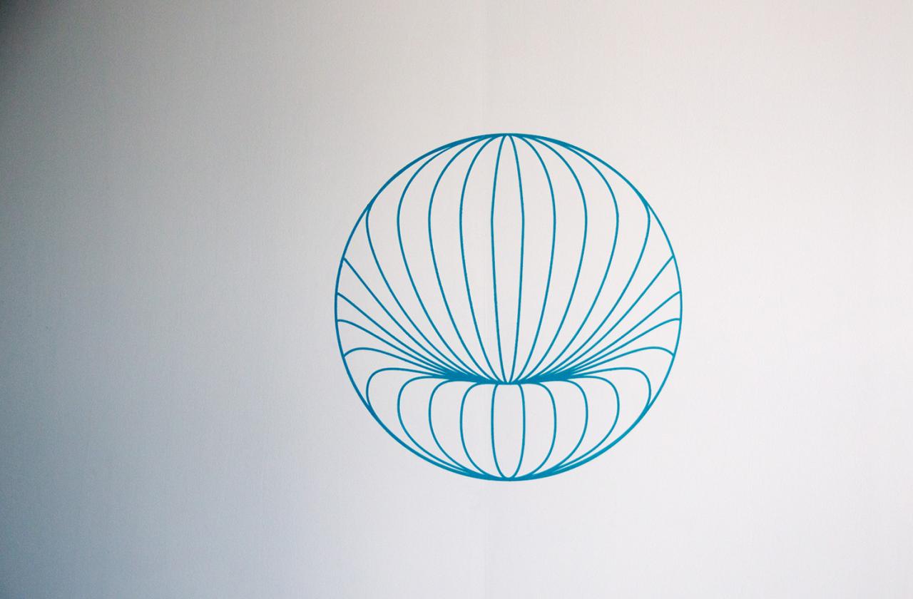 Projections redressées (globes), 2017, peintures murales et bas-reliefs en contreplaqué, dimensions variables
