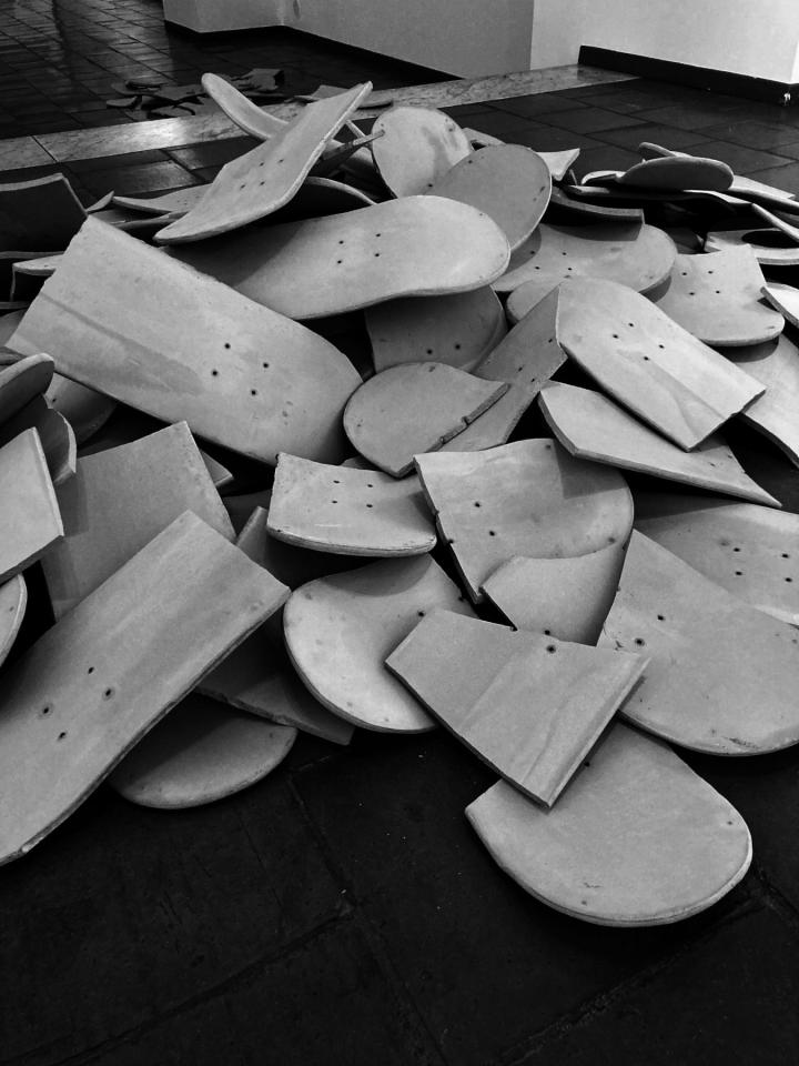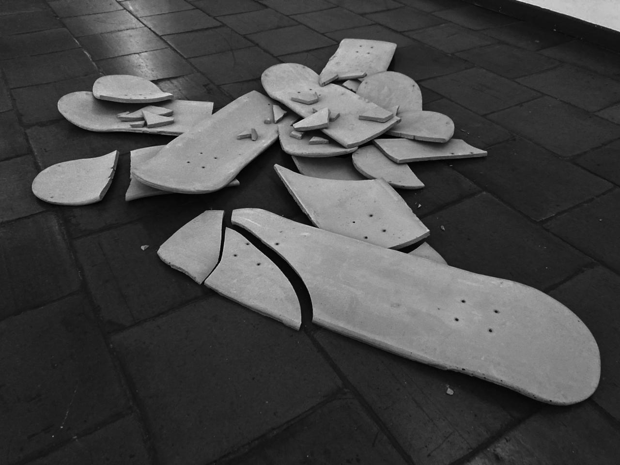 Coalesce, 2021, planches de skate en béton, son, dimensions variables, vue de l’exposition Coalesce, La Capelleta, Céret, 2021