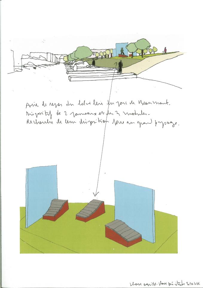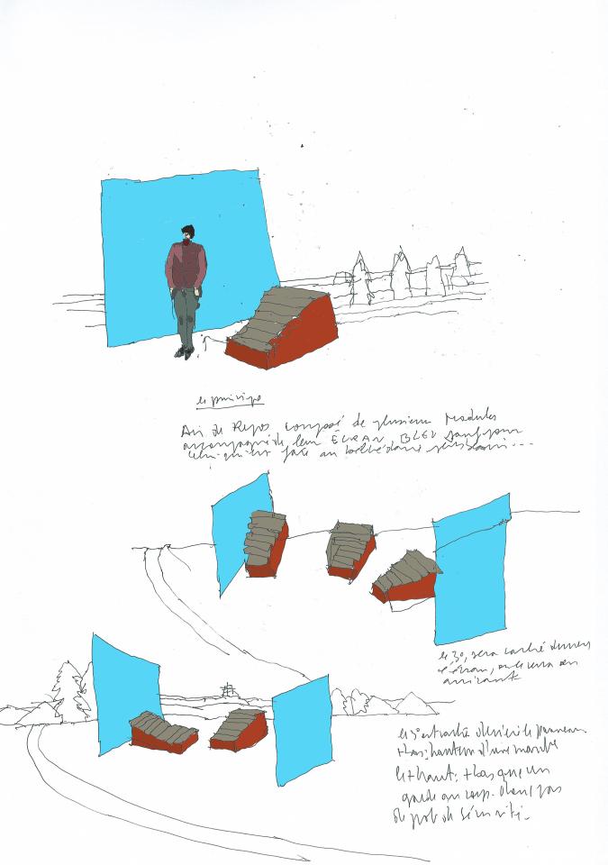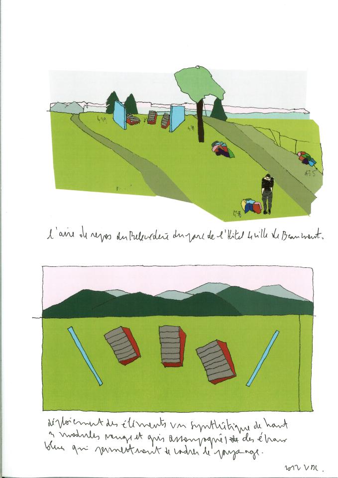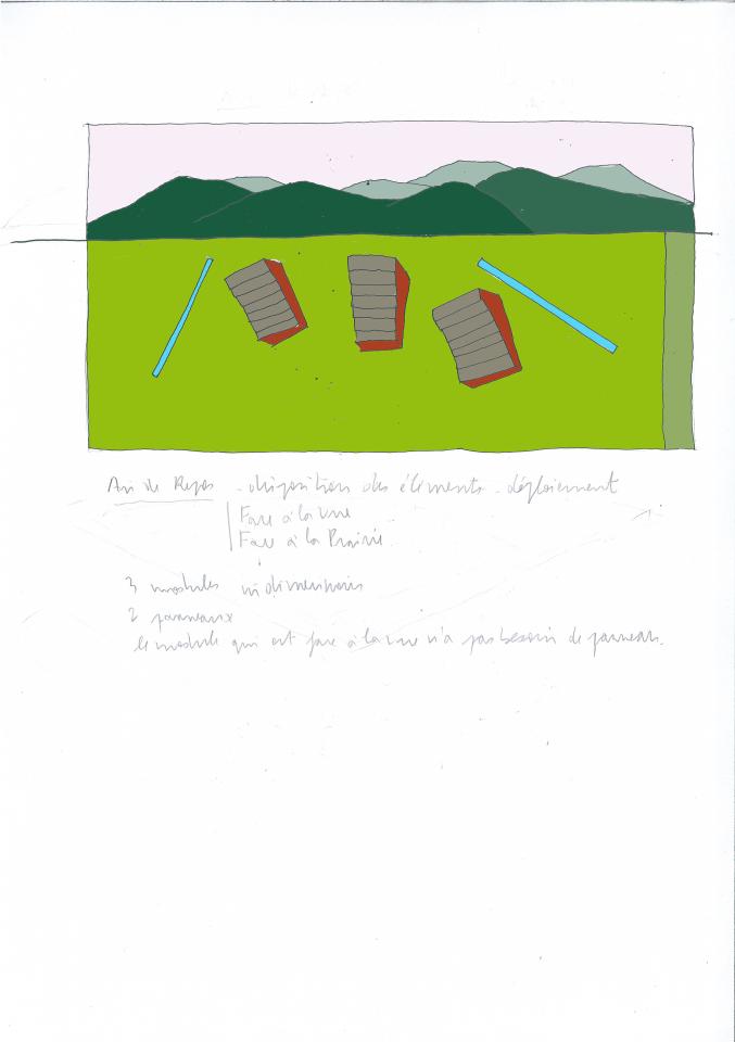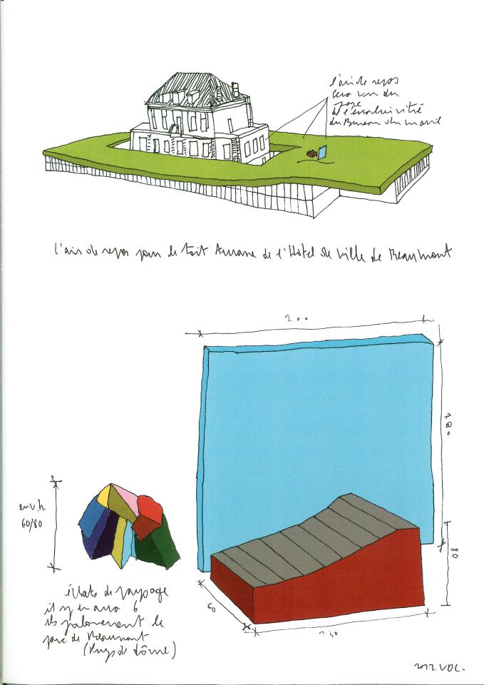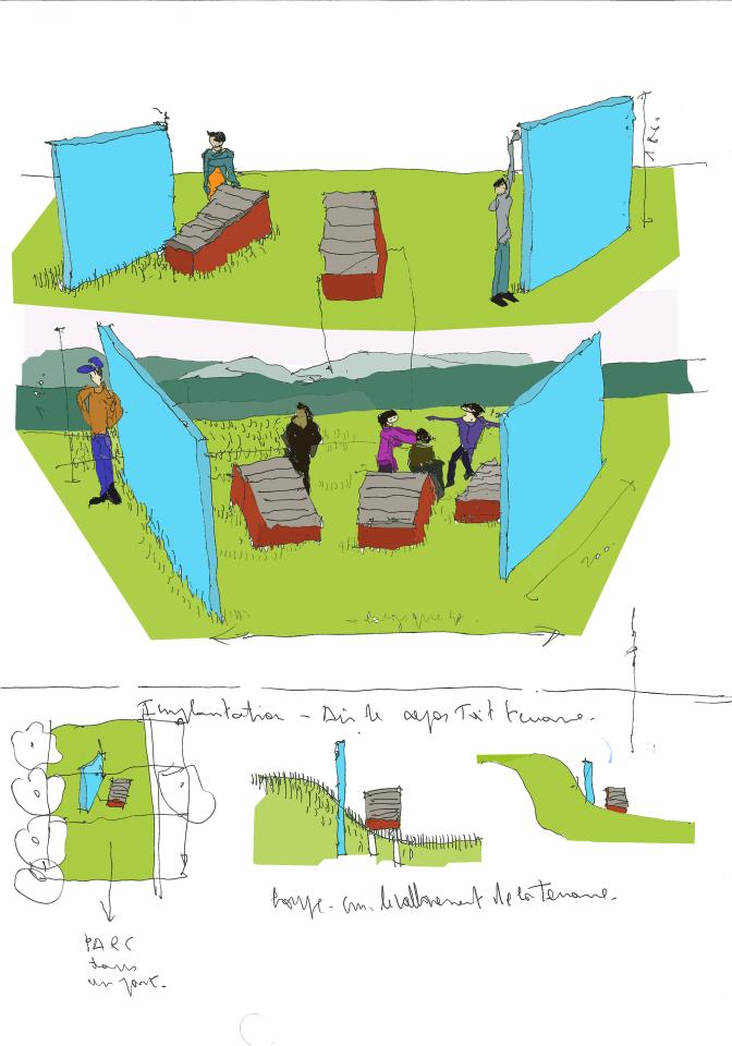 - Air(e)s de repos : sculptures composées d’un module en contreplaqué peint et d’un panneau en résine monobloc teinté dans la masse. Elles sont implantées au fond du parc, sur une zone formant un belvédère sur le grand paysage, et un élément sur le toit terrasse du bâtiment.