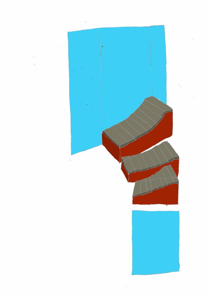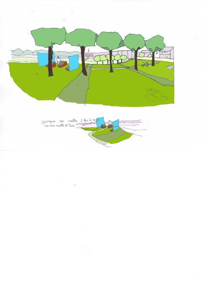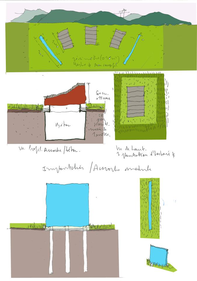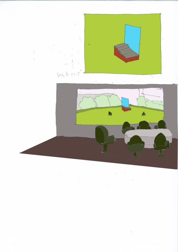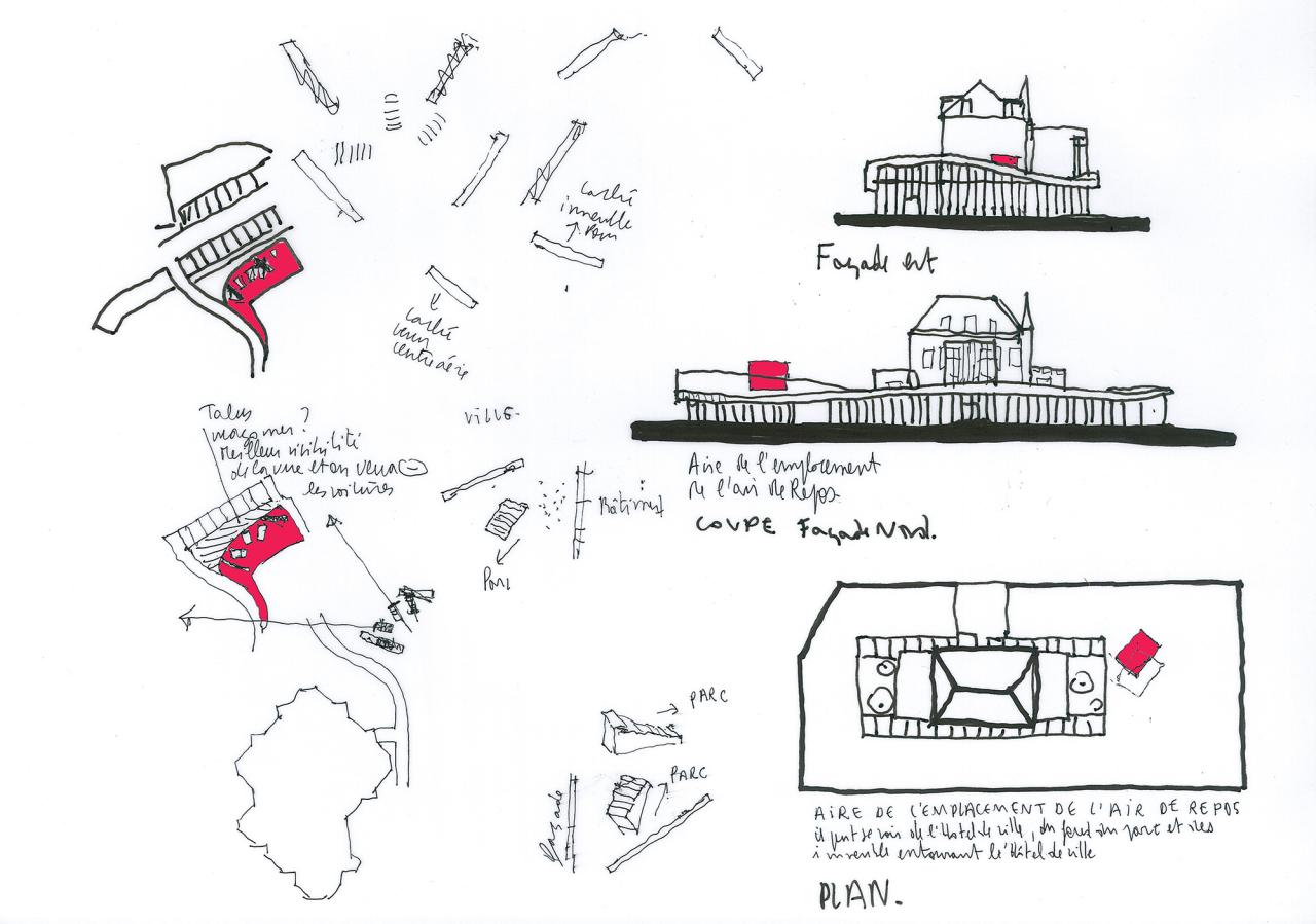 - Air(e)s de repos : sculptures composées d’un module en contreplaqué peint et d’un panneau en résine monobloc teinté dans la masse. Elles sont implantées au fond du parc, sur une zone formant un belvédère sur le grand paysage, et un élément sur le toit terrasse du bâtiment.