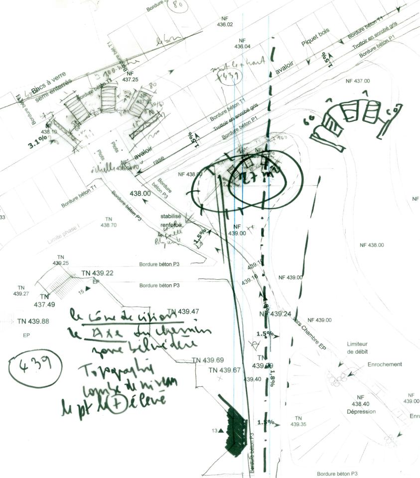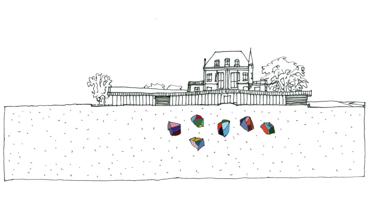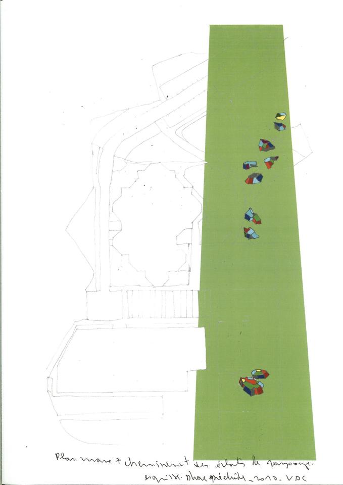 - Éclats de paysage : blocs de roches naturelles (basalte) extraits in situ lors des terrassements, peints et disposés dans le parc. Ils en jalonnent le parcours.