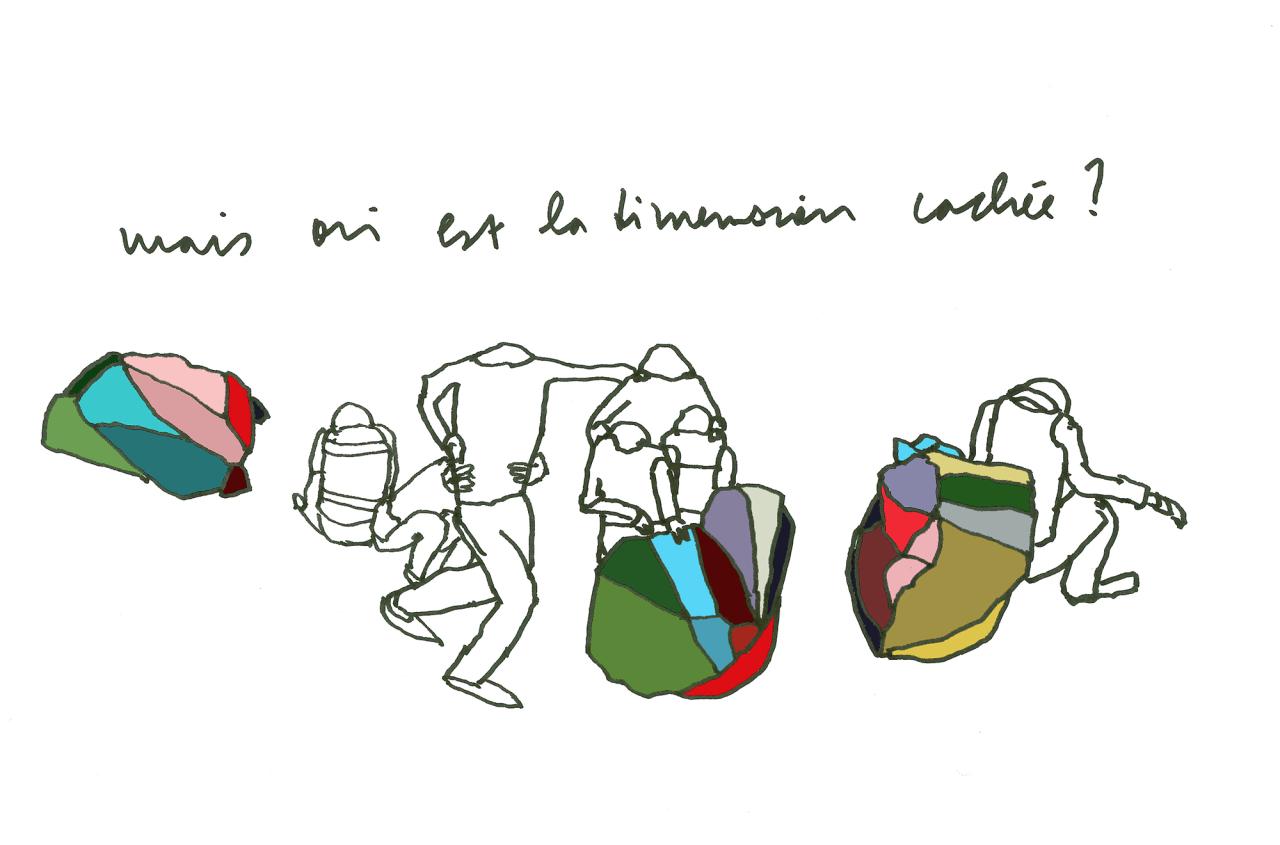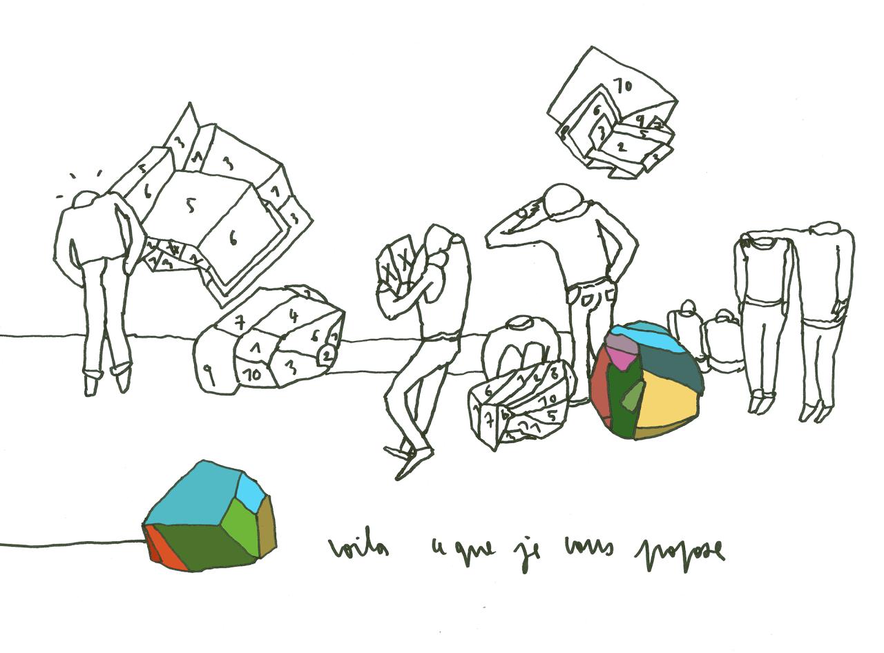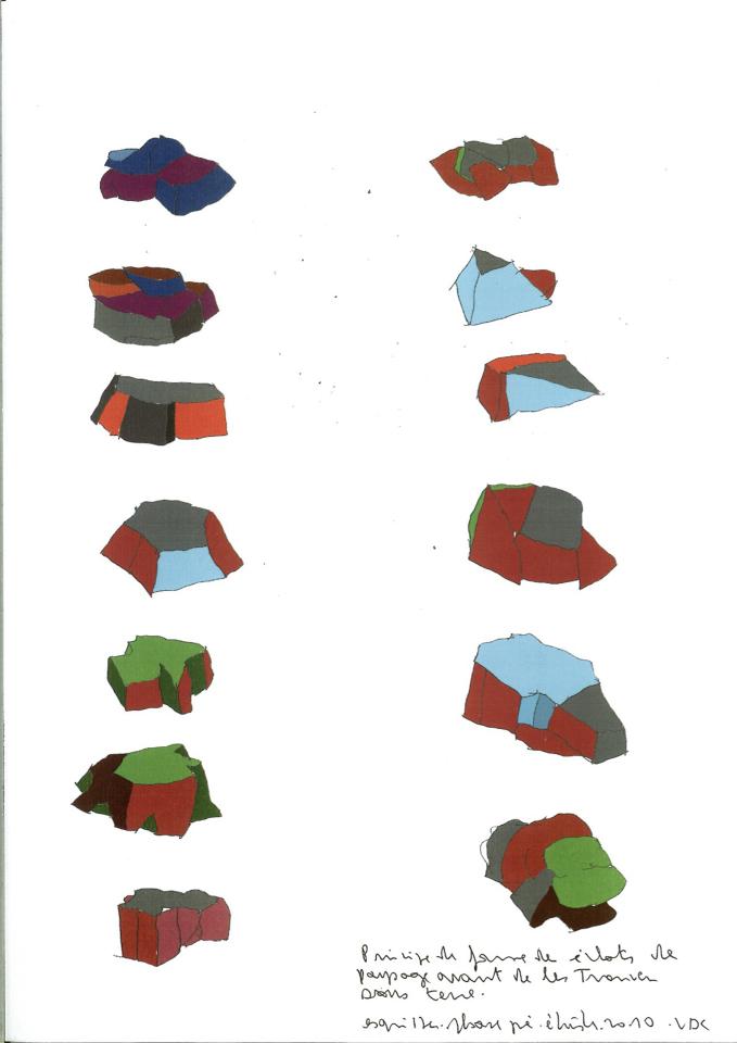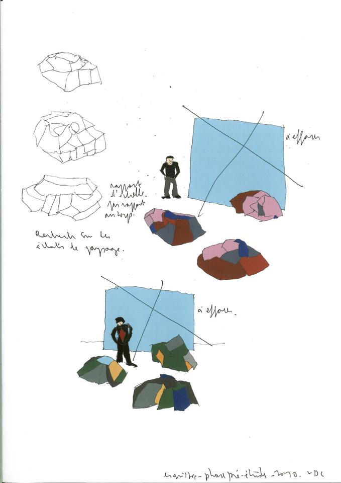Air(e)s de repos et éclats de paysage, 2015, bois peint, résine, roches naturelles extraites in situ, acrylique