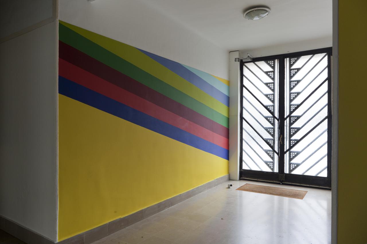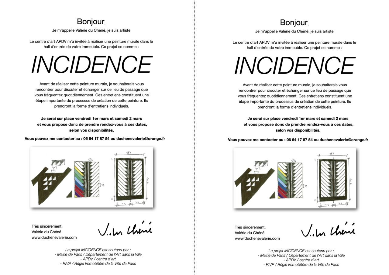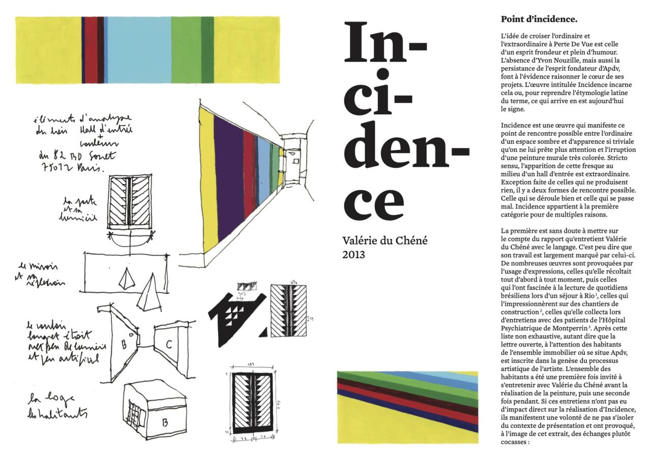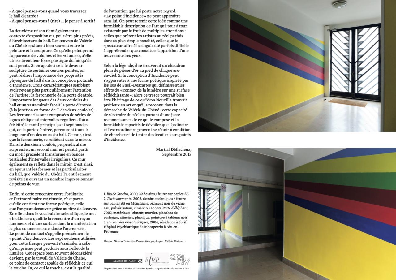 (…) Incidence est une œuvre qui manifeste ce point de rencontre possible entre l’ordinaire d’un espace sombre et d’apparence si triviale qu’on ne lui prête plus attention et l’irruption d’une peinture murale très colorée. (…) En effet, dans le vocabulaire scientifique, le mot « incidence » qualifie la rencontre d’un rayon lumineux et d’une surface dont la manifestation la plus connue est sans doute l’arc-en-ciel. Le point de contact s’appelle précisément le « point d’incidence ». Les sept couleurs utilisées pour cette fresque peuvent s’assimiler à celle qu’un prisme peut produire sous l’effet de la lumière. Cet espace bien souvent déconsidéré devient, par le travail de Valérie du Chéné, ce point de contact capable de réfléchir ce qui le touche. Or, ce qui le touche, c’est la qualité de l’attention que lui porte notre regard. « Le point d’incidence » ne peut apparaitre sans lui. On peut retenir cette idée comme une formidable description de l’art qui, tour à tour, existerait par le fruit de multiples attentions : celles que prêtent les artistes au réel parfois dans sa plus simple banalité, celles que le spectateur offre à la singularité parfois difficile à appréhender que constitue l’apparition d’une œuvre sous ses yeux. (…)