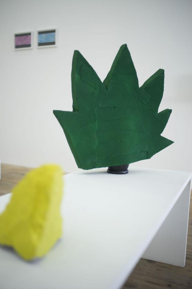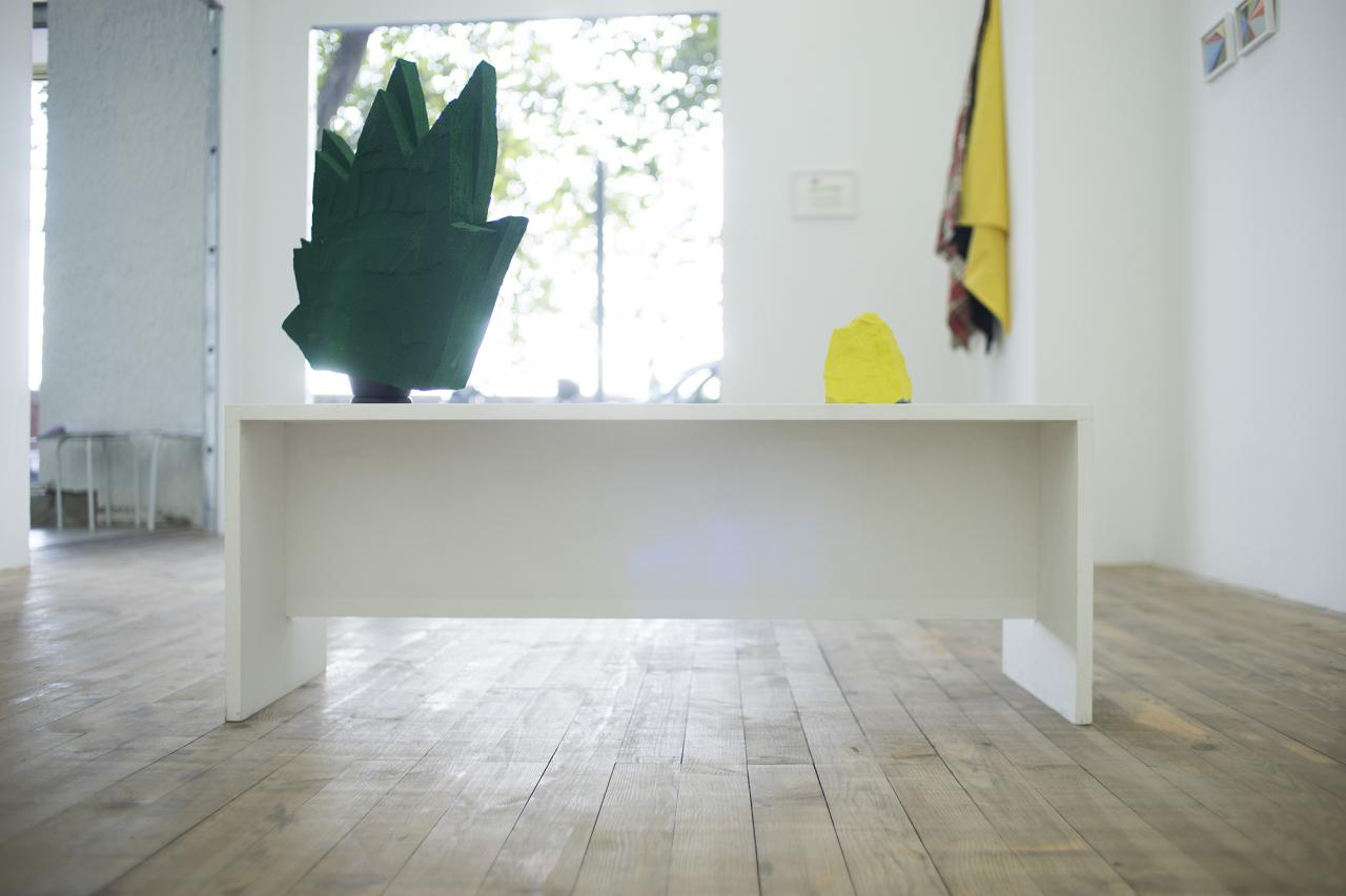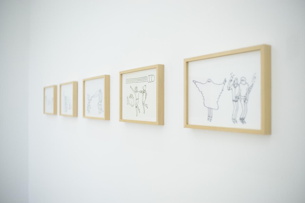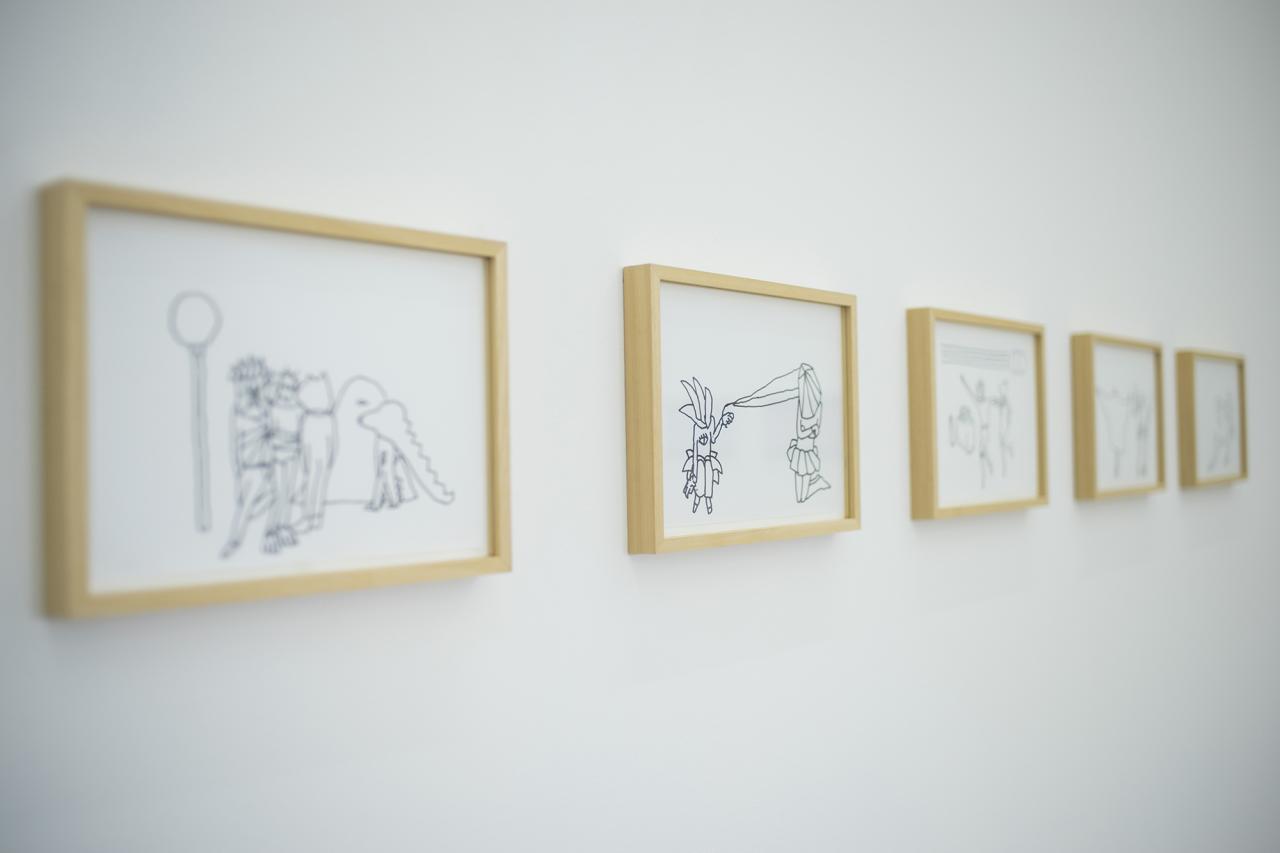 Nous avons fait le choix, dés le départ, de les présenter dans le cadre d’une exposition classique, protocole singulier mais idéal à la construction mentale de ce projet. La hiérarchie de monstration parle ici de peinture, de sculpture, d’objets et d’installation, puis induit les modalités de présentation du film. Il s’agit de les faire exister hors des images. Ces objets parlent de l’avant, du pendant et de l’après du film. Un jeu de va-et-vient est activé entre les dessins, le film et les objets. Réinvestis par les images cinématographiques, les objets parlent de situations extraites d’un autre contexte, le film. Activés comme « accessoires », accompagnateurs de personnages et de situations, ils supportent une narration chargée de ce supplément d’âme qui nous parlent des choses. Ces objets ont donc une double parole, ils oscillent entre forme narrative à regarder et compagnon d’actions et de dialogues pour le film.