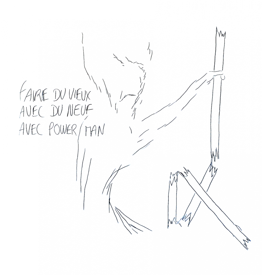 C’est un personnage à peine esquissé, fripé, très vieux qui, hiératique, brandit avec assurance un très long bâton brisé en plusieurs morceaux formant le chiffre romain “neuf”. Il est écrit “Faire du vieux avec du neuf”. C’est la parabole de la simulation du changement et de la nouveauté présentée par quelqu’un qui ne semble pas en avoir les compétences.