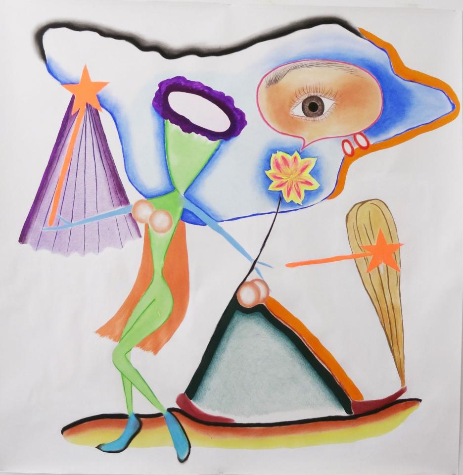 Il s’agit d’une scène burlesque réunissant deux créatures. L’une possède une tête humaine au teint jaune fluorescent, pourvue de très longues oreilles d’âne bleutées, vêtue d’une longue jupe noire étroite comme un socle. Ce personnage brandit deux paires de lunettes ou peut-être des masques occultants, colorés roses et oranges. L’autre créature, effrayée ou surprise, a un mouvement de recul. C’est une présence spectrale, moribonde, énucléée faite de tracés dynamiques violets verticaux. Au-dessus de la scène, des étoiles scintillent d’une tonalité chaude comme un feu d’artifice. Au sol, gît un amas de boules ressemblant à des globes oculaires encerclés d’une ligne rose et verte. Il est question parmi les artifices, d’un semblant de propositions de visions édulcorées, vaines et inappropriées infligées à un personnage incompris dont la détresse et la dépossession du savoir symbolisé par les globes oculaires au sol est proportionnelle à l’inexorable et répétitive privation de libre arbitre.