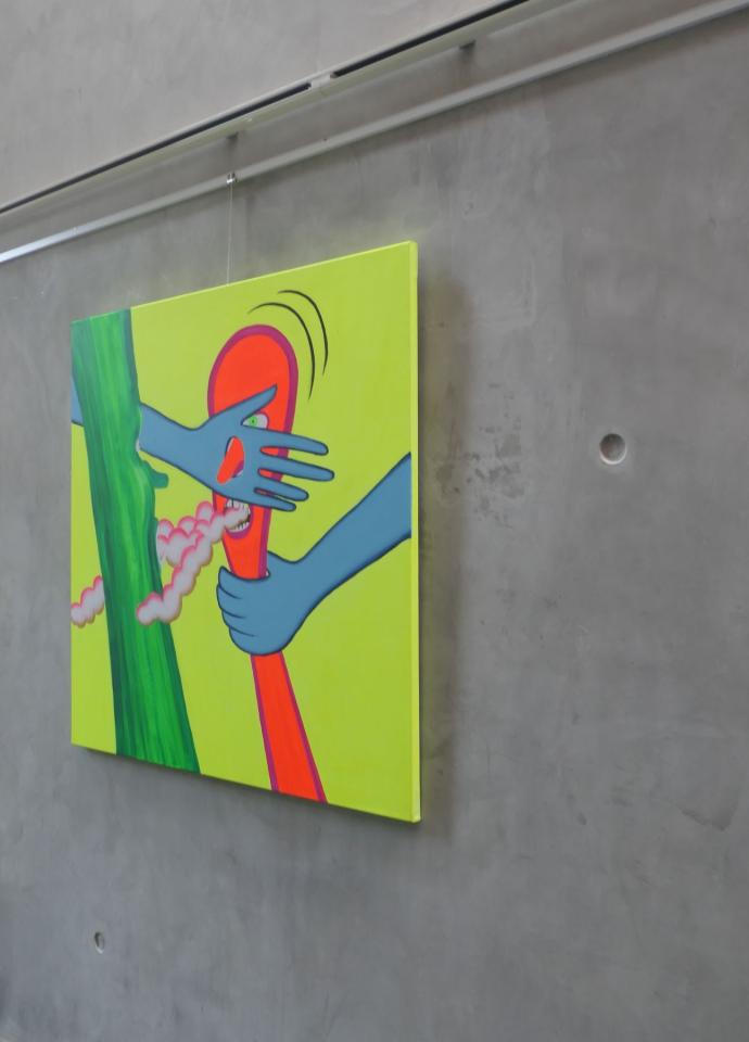 C’est la tête de trois quart d’une créature effrayée, ahurie, choquée par ce qu’elle semble voir hors champ, tout comme par les filaments verts fluo qui s’échappent ou pénètrent par son oreille et par son espèce de nez, l’un et l’autre hypertrophiés. La surface de sa peau est rose violacée, auréolée de clarté. D’énormes dents de rongeurs dépassent de sa bouche grande ouverte. Les yeux schématisés sont exorbités, écarquillés, opaques, aveugles, colorés en vert au ton froid alors que l’arrière-plan est un vert chaud foncé. Cette grotesque rend compte à la fois de l’intolérance à la pollution sonore et atmosphérique, tout comme elle rend compte de la difficulté à sensibiliser les climato-sceptiques aux notions écologiques rejetées ou mal perçues.