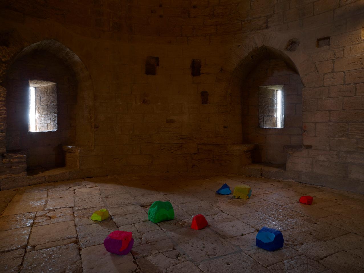 Valérie du Chéné, Les dormantes, 2022, 8 pierres peintes, acrylique sur calcaire, vue de l’exposition personnelle Le ton monte, Fort Saint-André, Villeneuve lez Avignon