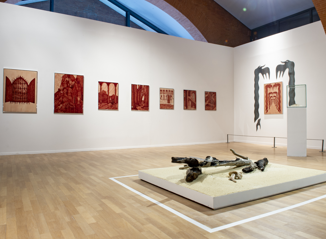 Fenêtre sur désolation, 2022, Sang humain sur papier, Amertume de l’ivresse, 2022, Sang humain sur papier, Le filage des montagnes, 2022, Sang humain sur papier, vue de l’exposition collective Mezzanine Sud – Prix des Amis des Abattoirs, 2022, Les Abattoirs, Musée – Frac Occitanie Toulouse, Toulouse, détail, photo Franck Alix