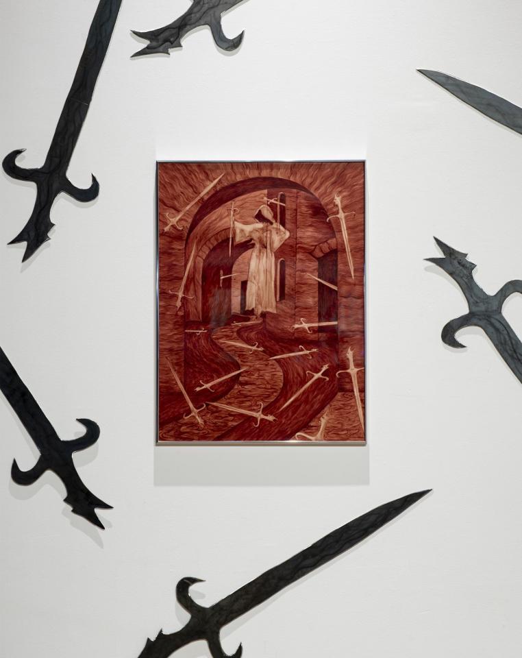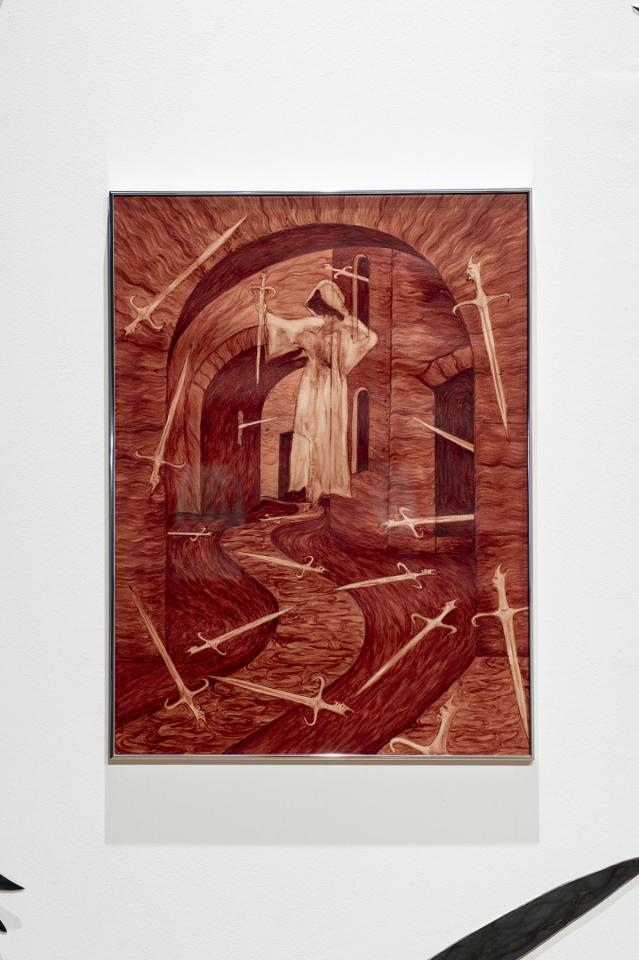 En intégrant le sang dans sa pratique du dessin, elle donne un tout autre statut à ce fluide vital qui porte en lui une force émotionnelle instinctive et transforme l’acte de peindre en une communion presque physique avec le support. Le sang, vecteur d’une relation synesthétique avec le fer, autre matériau central dans son œuvre, agit comme un catalyseur de l’acte créatif. Il exprime également un enfer contemporain (stress, anxiété sociale, traumatisme, angoisse…) que l’artiste transcrit par cette pratique du dessin obsessionnelle et cathartique, mais aussi par le biais de vidéos et d’installations.