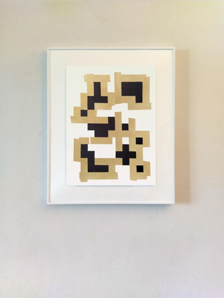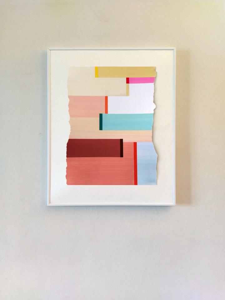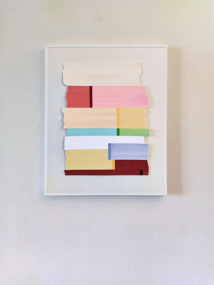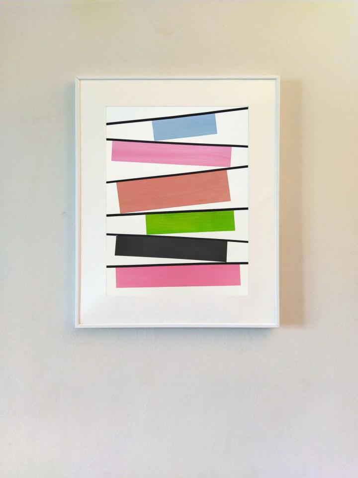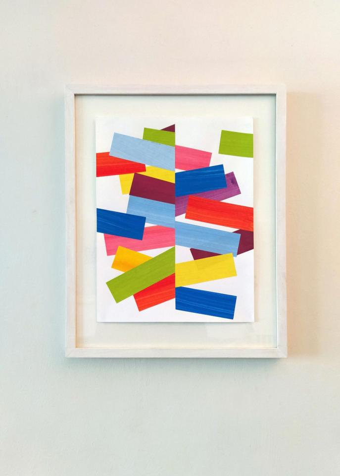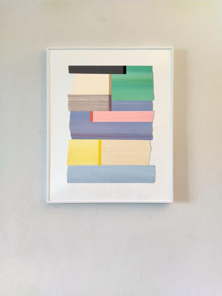 Mes réalisations de collages de papiers gouachés se déploient en séries construites sur une grille de lignes horizontales et verticales structurant la surface.